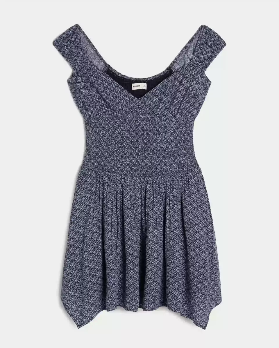 Jolie et ultra douce, cette mini-robe présente un ourlet asymétrique et des manches courtes à épaules dénudées. Taille smockée douce et poches. Importée.