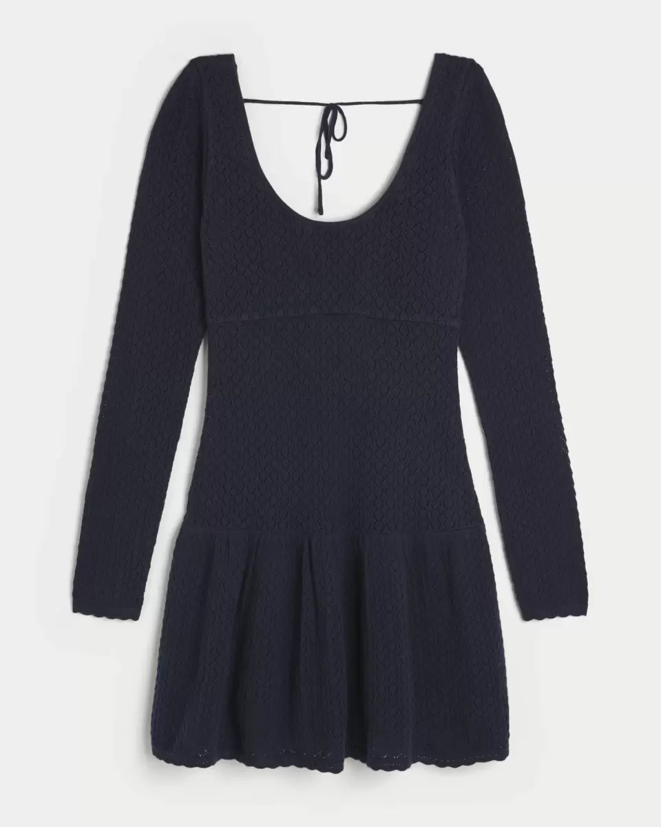 Cette jolie robe courte à manches longues est confectionnée dans un tissu pointelle ultra doux façon crochet. Elle présente une encolure dégagée et une taille basse. Un lien ouvert au dos et un soutien-gorge intégré assurent un bon maintien. Importé.