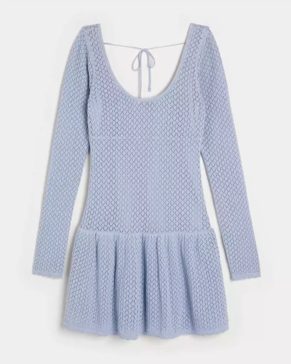 Une jolie robe à manches longues ultra douce, ornée de motifs surpiqués façon crochet, d’une jupe patineuse et d’un dos nu. Soutien-gorge intégré et encolure dégagée. Importé.