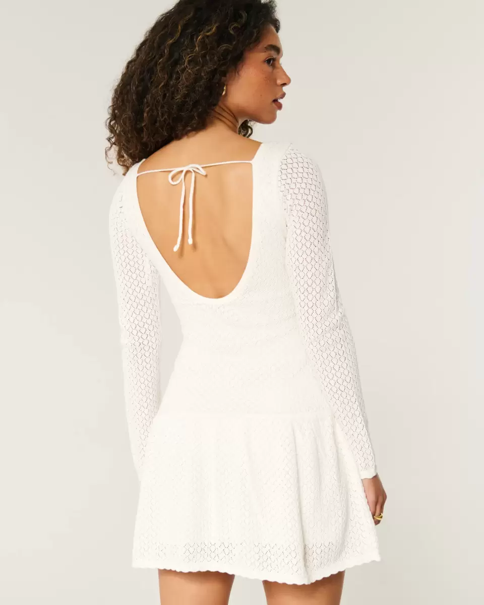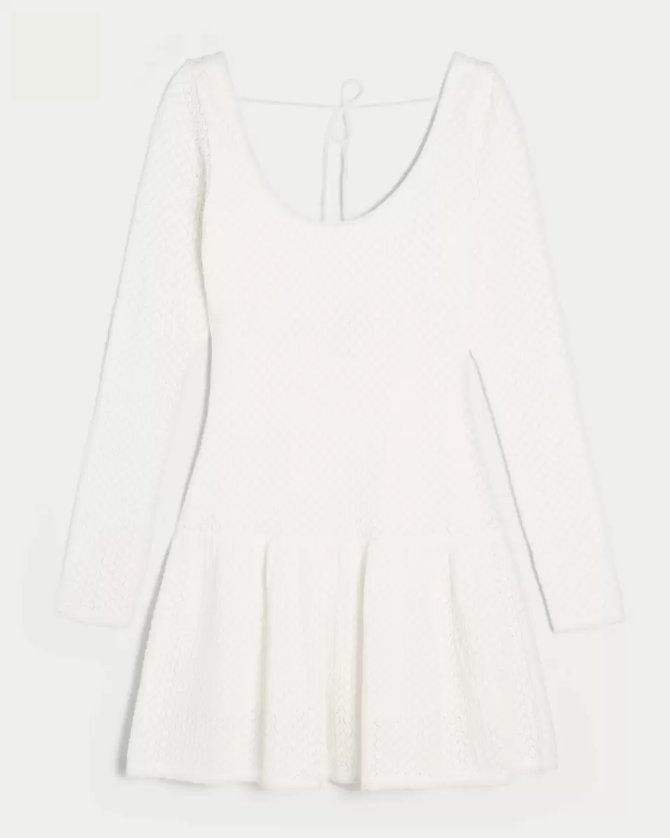 Une jolie robe à manches longues ultra douce, ornée de motifs surpiqués façon crochet, d’une jupe patineuse et d’un dos nu. Soutien-gorge intégré et encolure dégagée. Importé.