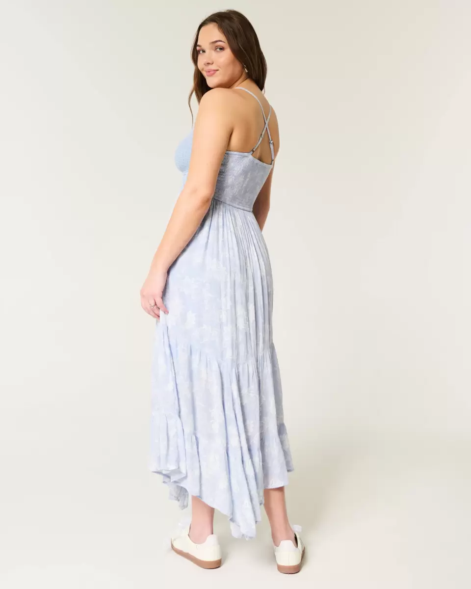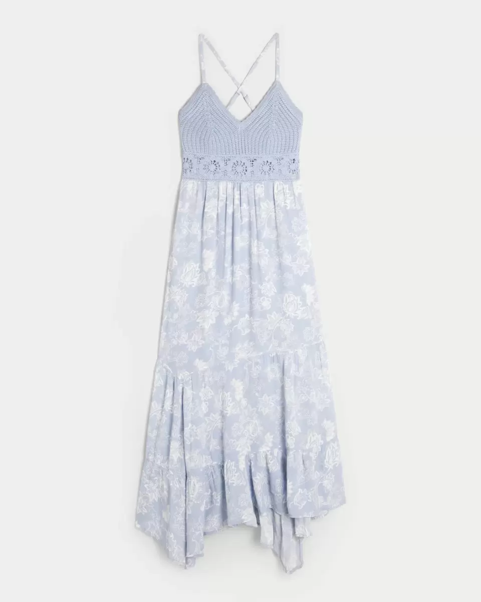 Cette jolie robe longue présente un mélange de tissus avec un corsage crocheté ultra doux et une jupe tissée fluide. Motifs surpiqués, ourlet asymétrique, col en V, bretelles croisées réglables dans le dos et poches. Importé.