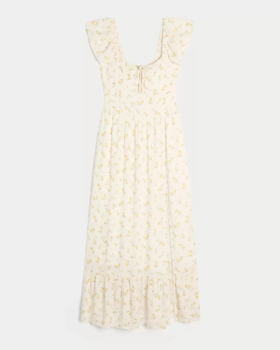 Fluide et ultra douce, cette robe longue présente un ourlet fendu, des manches flottantes et un lien central à l’encolure.