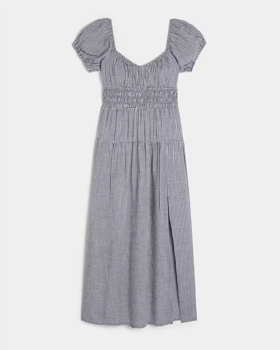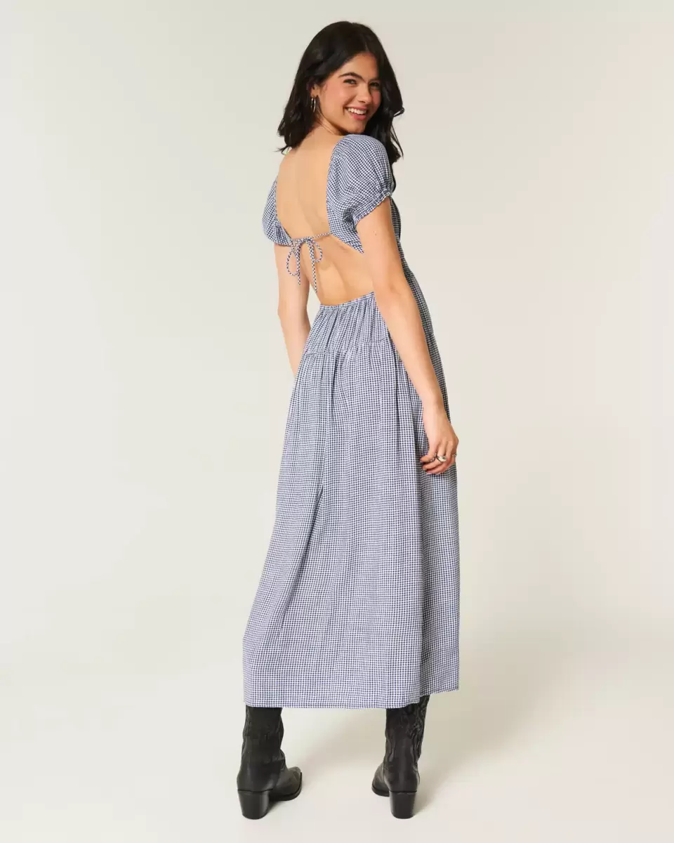 Une jolie robe longue ultra douce avec un dos ouvert et des coussinets amovibles. Manches courtes, poches, taille smockée douce et ourlet fendu. Importé.