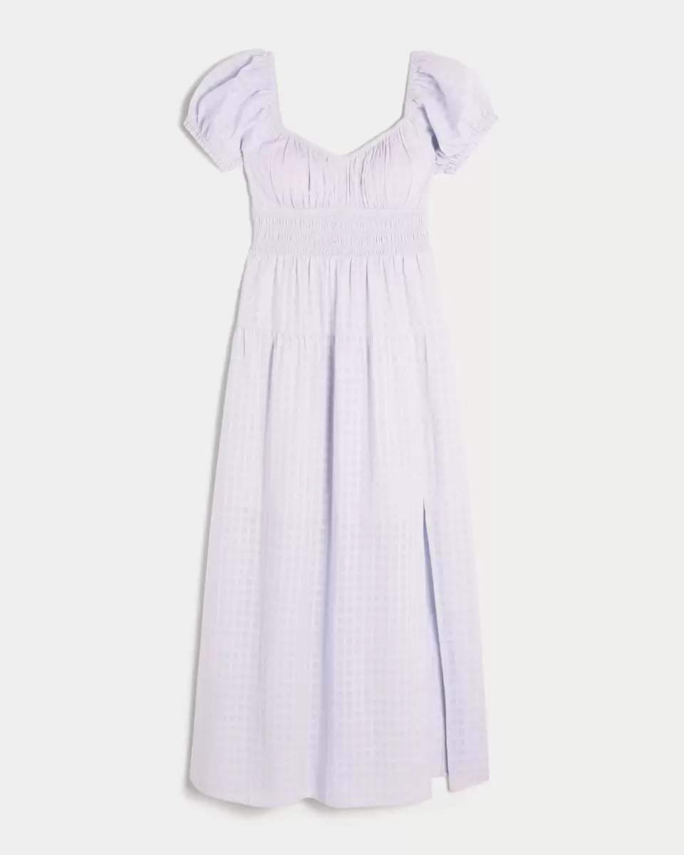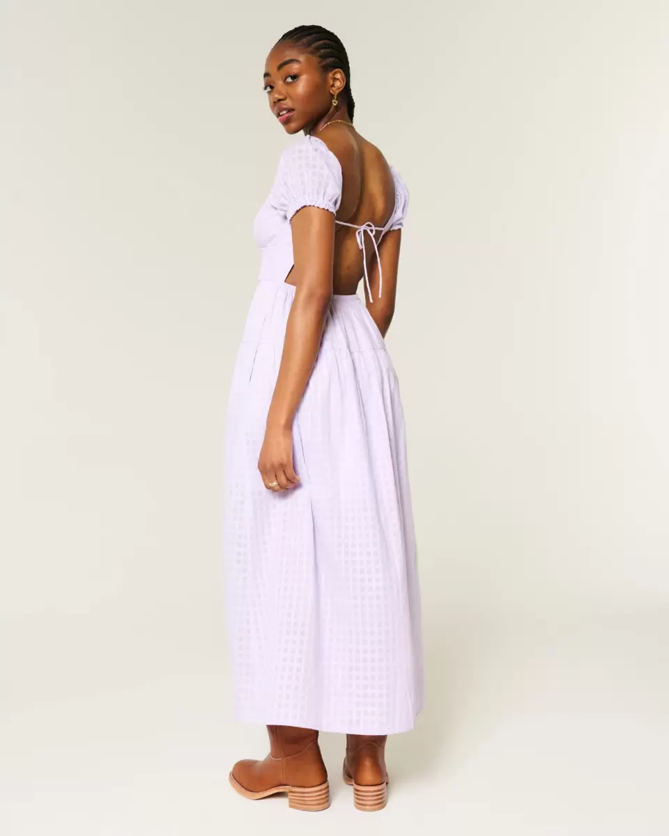 Une jolie robe longue ultra douce avec un dos ouvert et des coussinets amovibles. Manches courtes, poches, taille smockée douce et ourlet fendu. Importé.