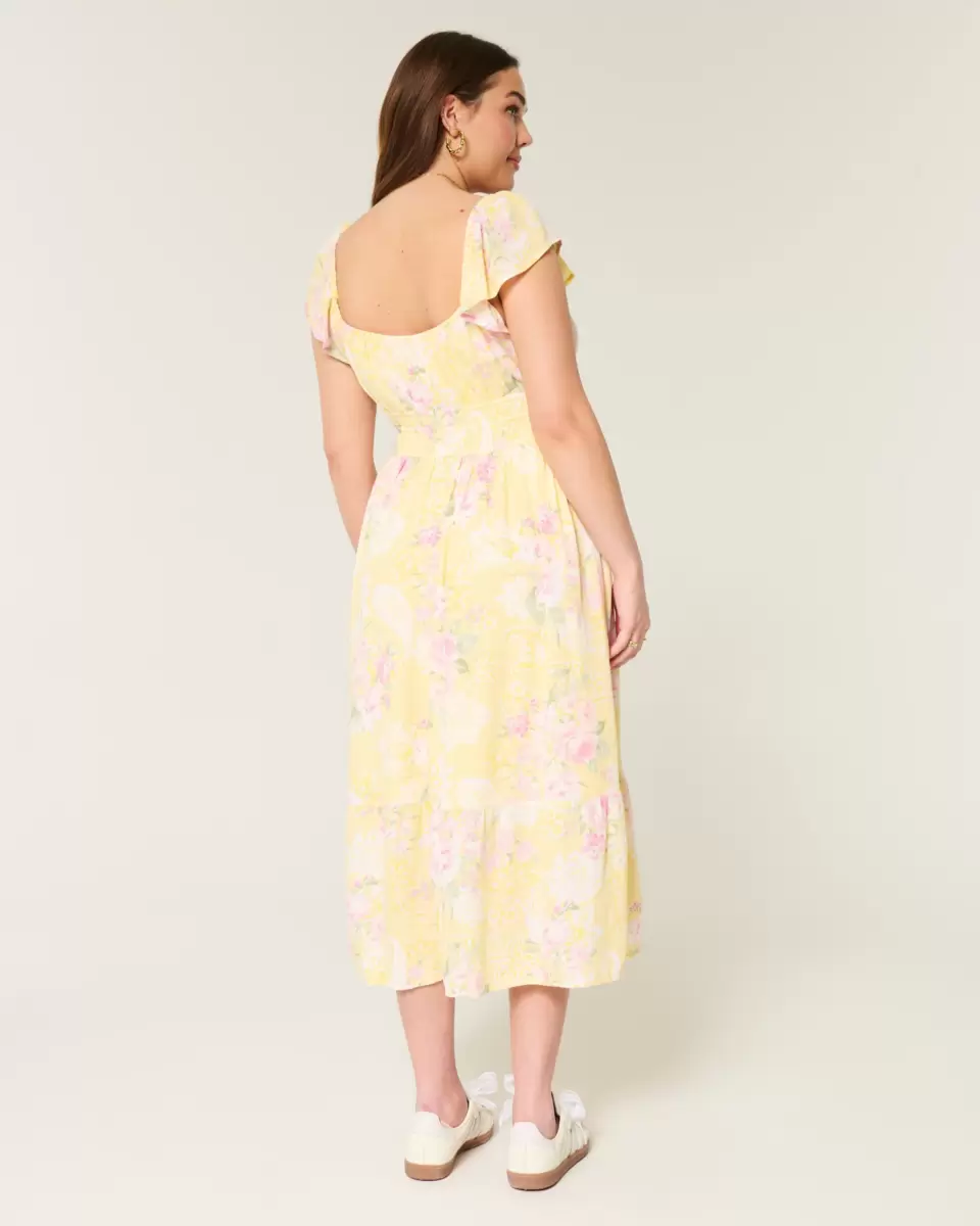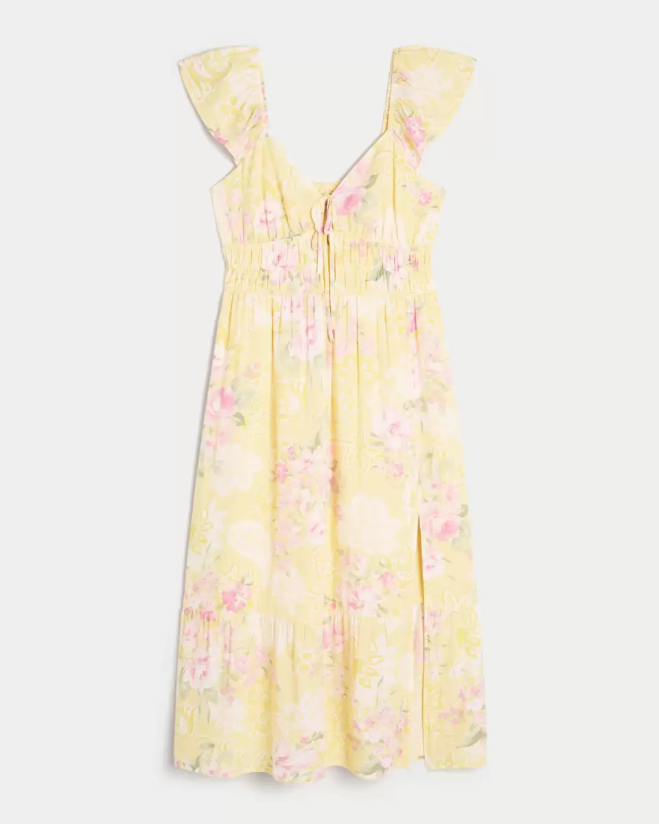 Jolie et ultra douce, cette robe mi-longue présente des manches flottantes, des poches et un lien à nouer sur le devant. Taille cintrée avec double lien. Importée.