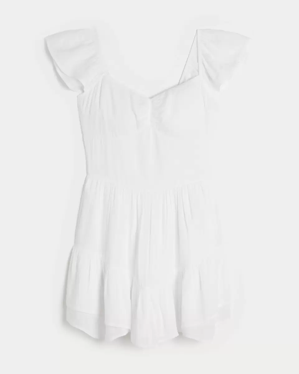 Robe jupe-short fluide et ultra douce, avec manches flottantes, poitrine pincée et jupe fluide. Dos smocké doux, joli ourlet à volants. Importé.