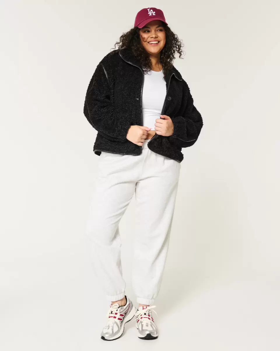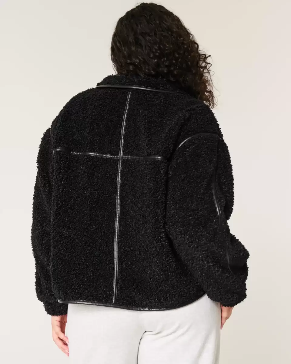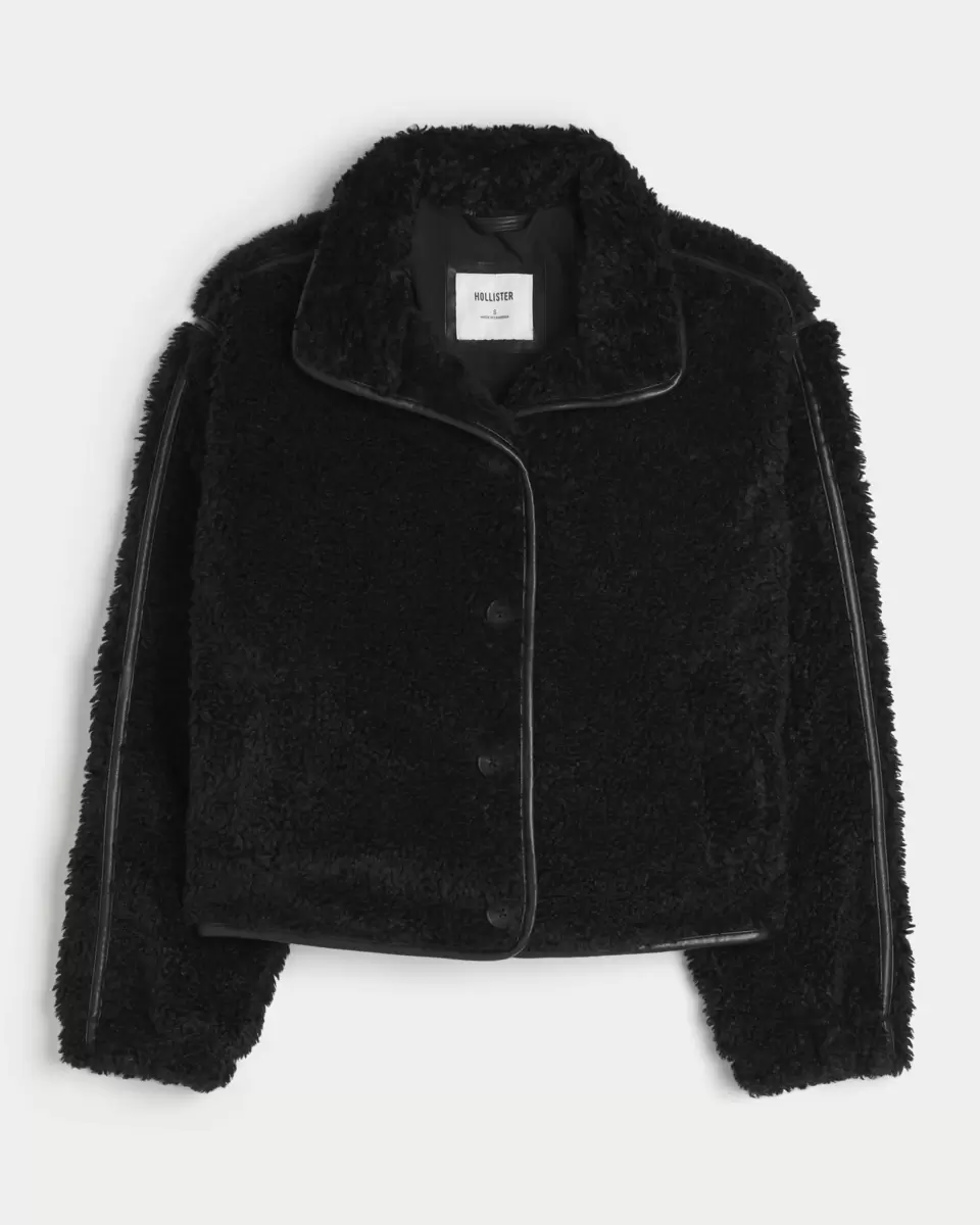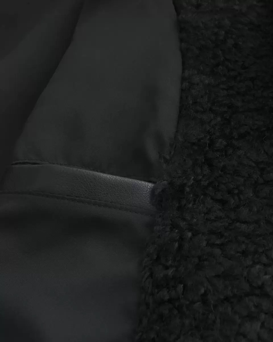 Une jolie veste à la silhouette motarde, confectionnée en tissu sherpa ultra doux. Bordure en similicuir, fermeture boutonnée, poches et doublure intégrale. Importé.