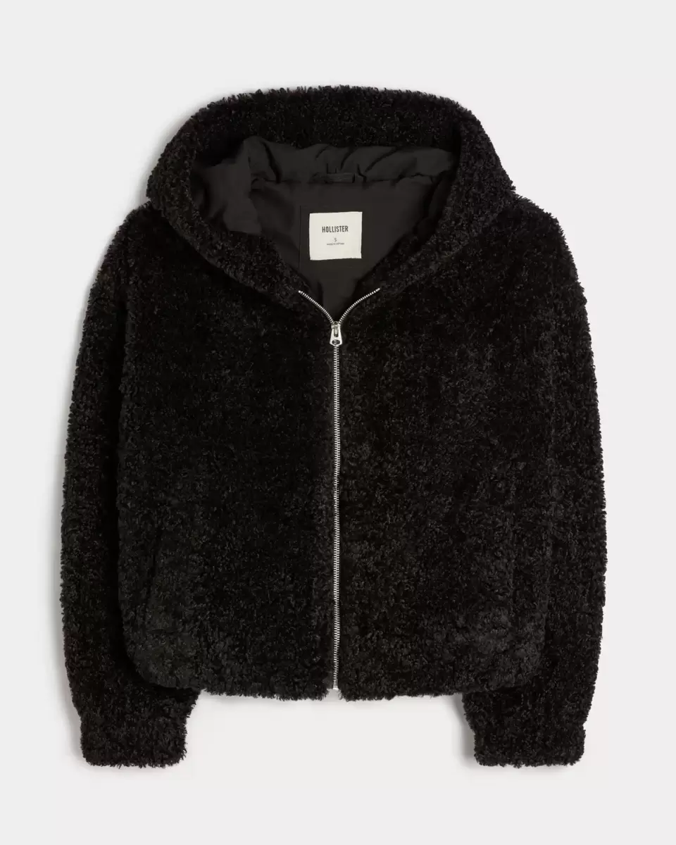 Une jolie veste douillette en fausse fourrure bouclée avec fermeture éclair et capuche. Poignets et poches à bande, entièrement doublée, poches intérieures. Importé.