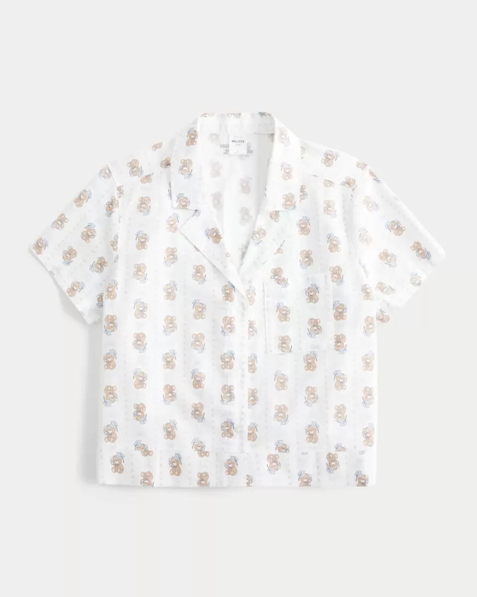 Une jolie chemise de nuit en tissu doux 100 % coton avec un motif ours en peluche sur l’ensemble. Fermeture boutonnée, col, manches courtes, poche poitrine gauche. Coupe facile. Importé.
