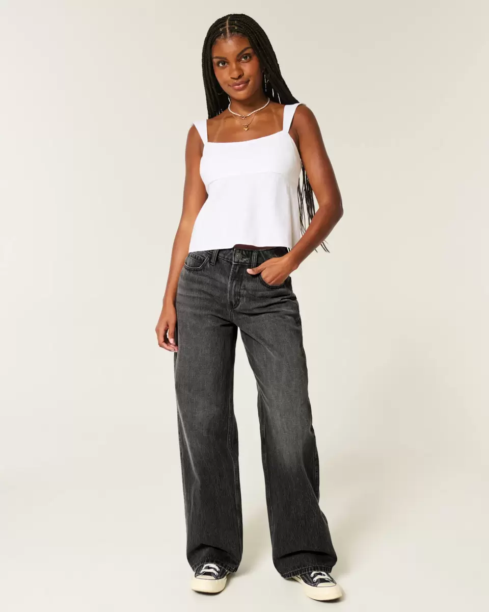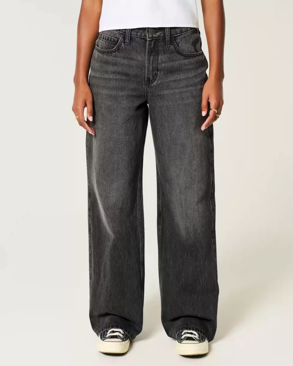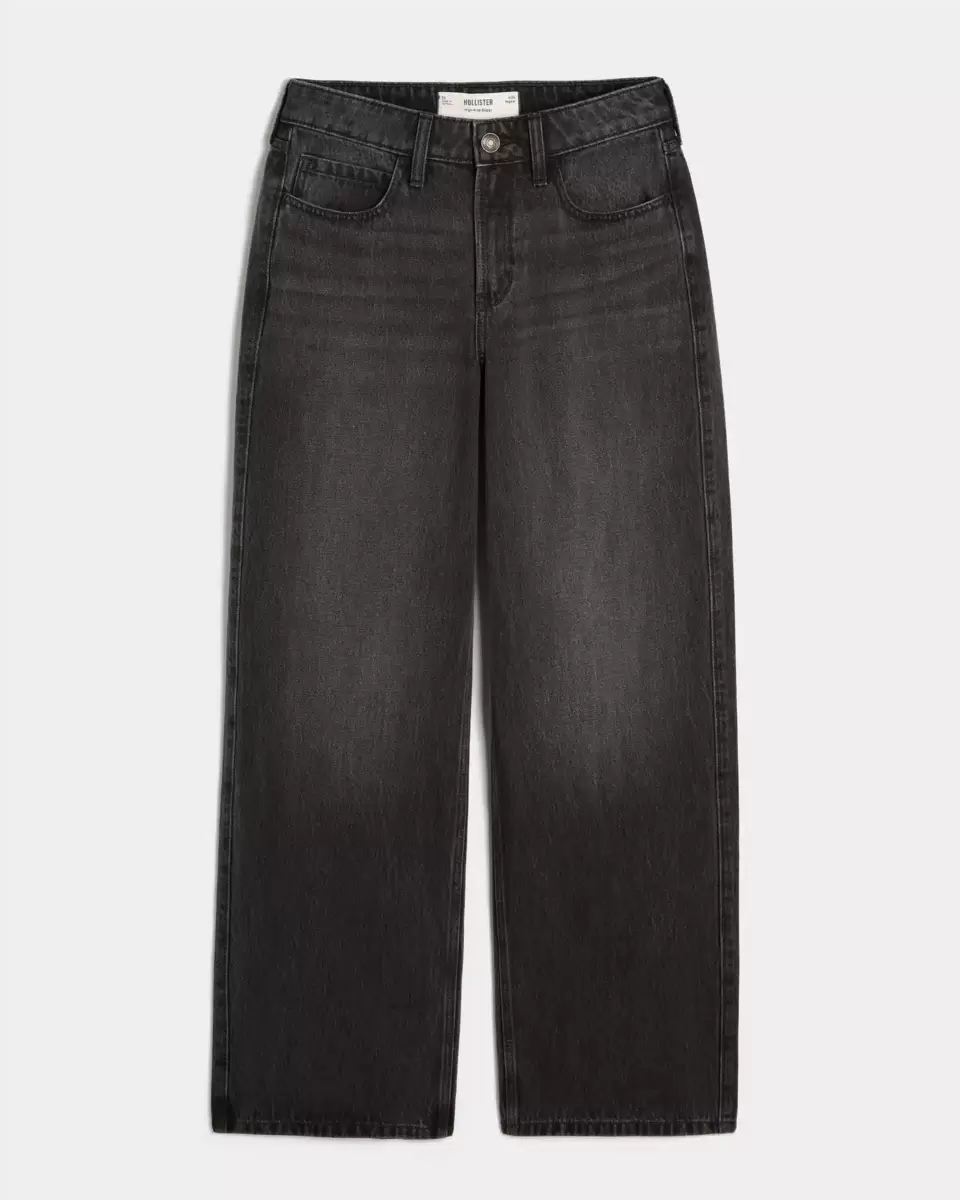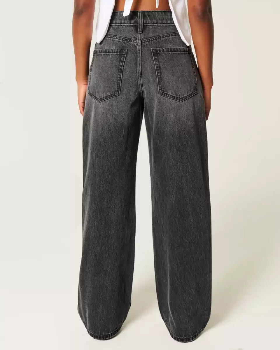 Jean confortable en denim, taille haute flatteuse et jambe ample. Noir délavé, avec décoloration et moustaches. Importé.