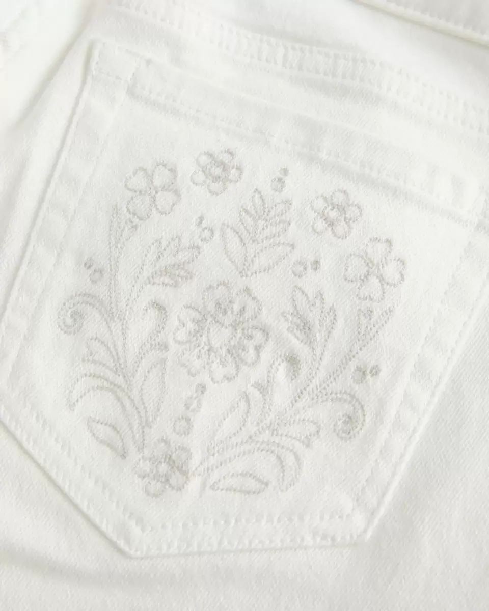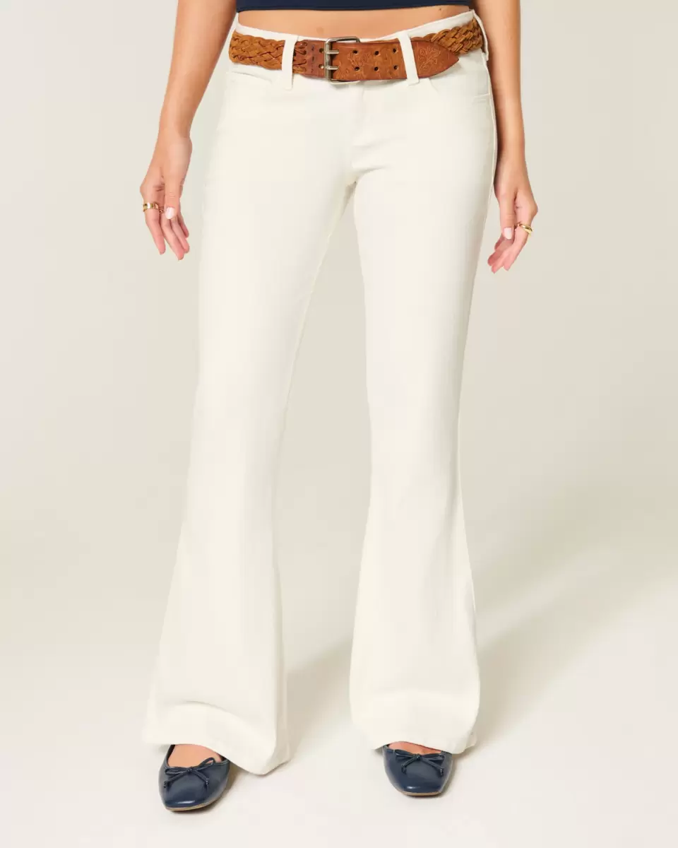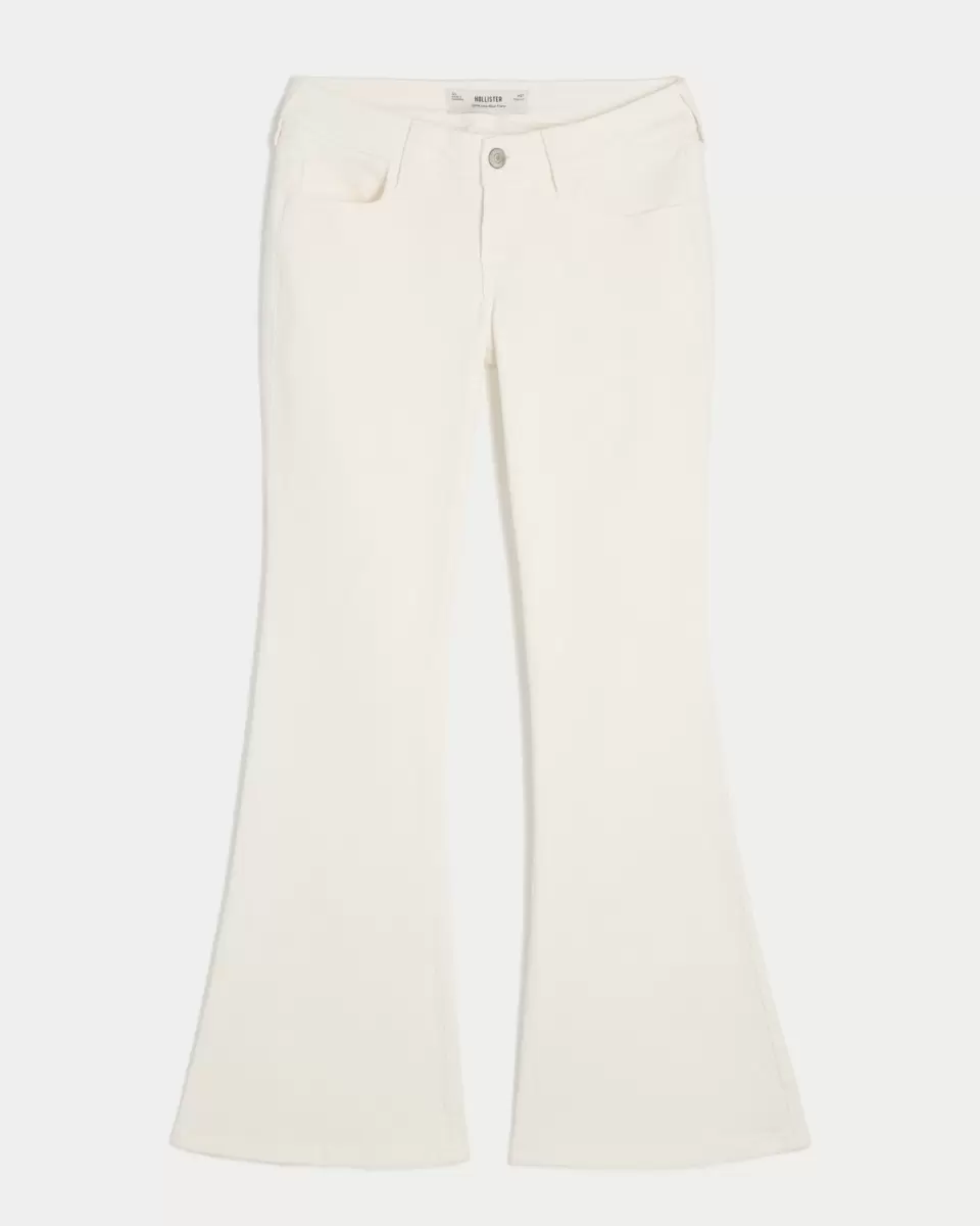 Jean confortable en denim extensible vintage, avec une taille ultra basse et un ourlet évasé. Motif brodé sur la poche arrière. Importé.