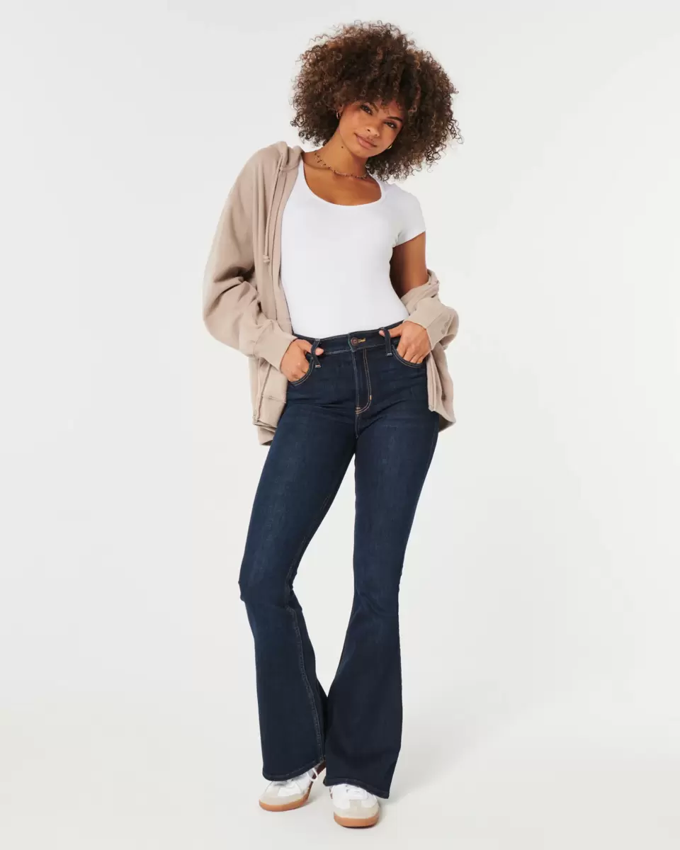 Ajusté jusqu’aux cuisses et évasé du genou à l’ourlet, ce jean délavé foncé présente une taille haute flatteuse. Décoloration et effet moustaches. Importé.