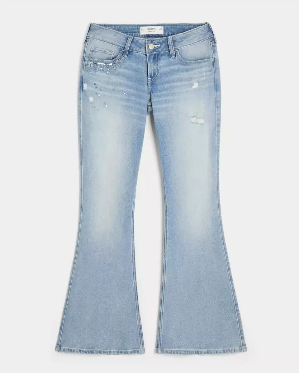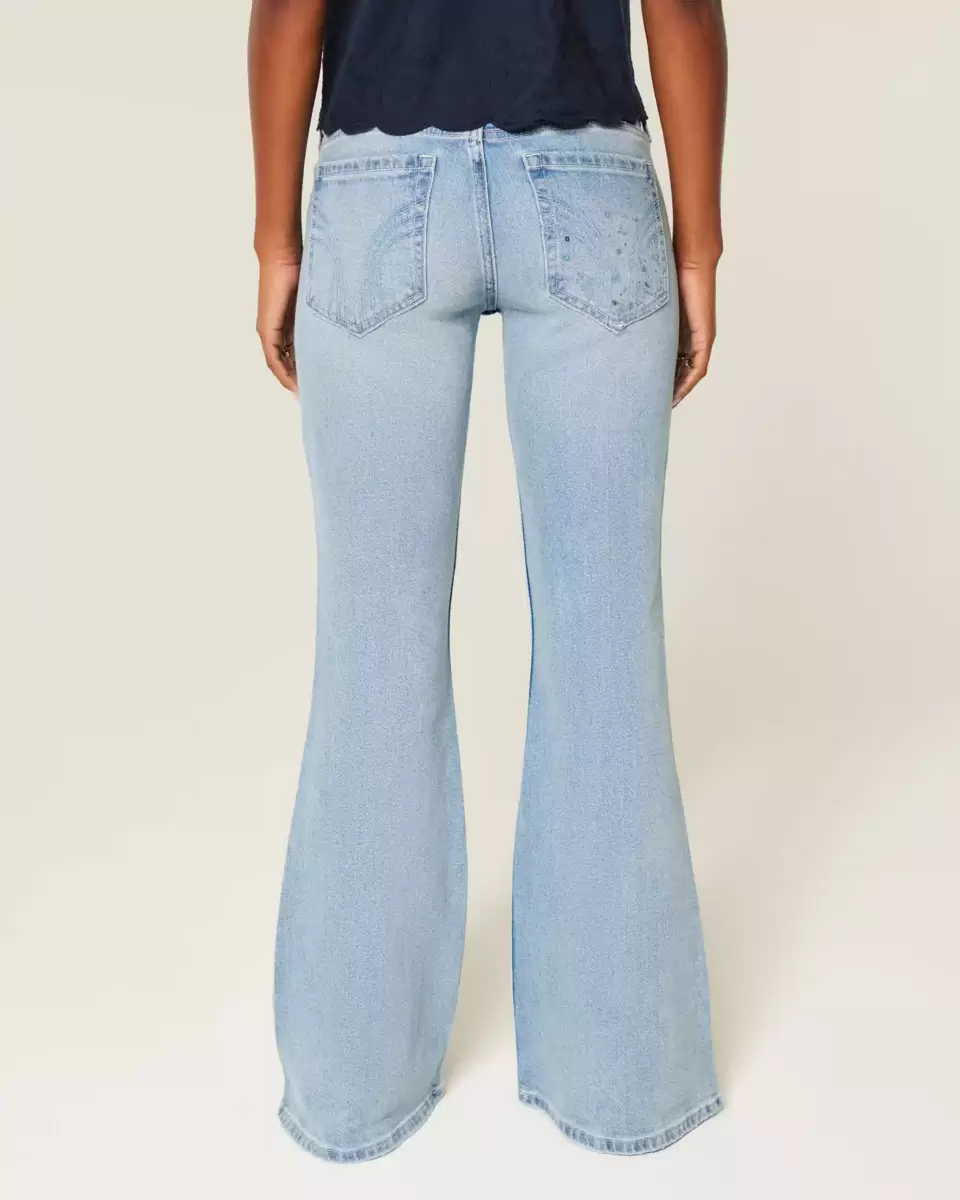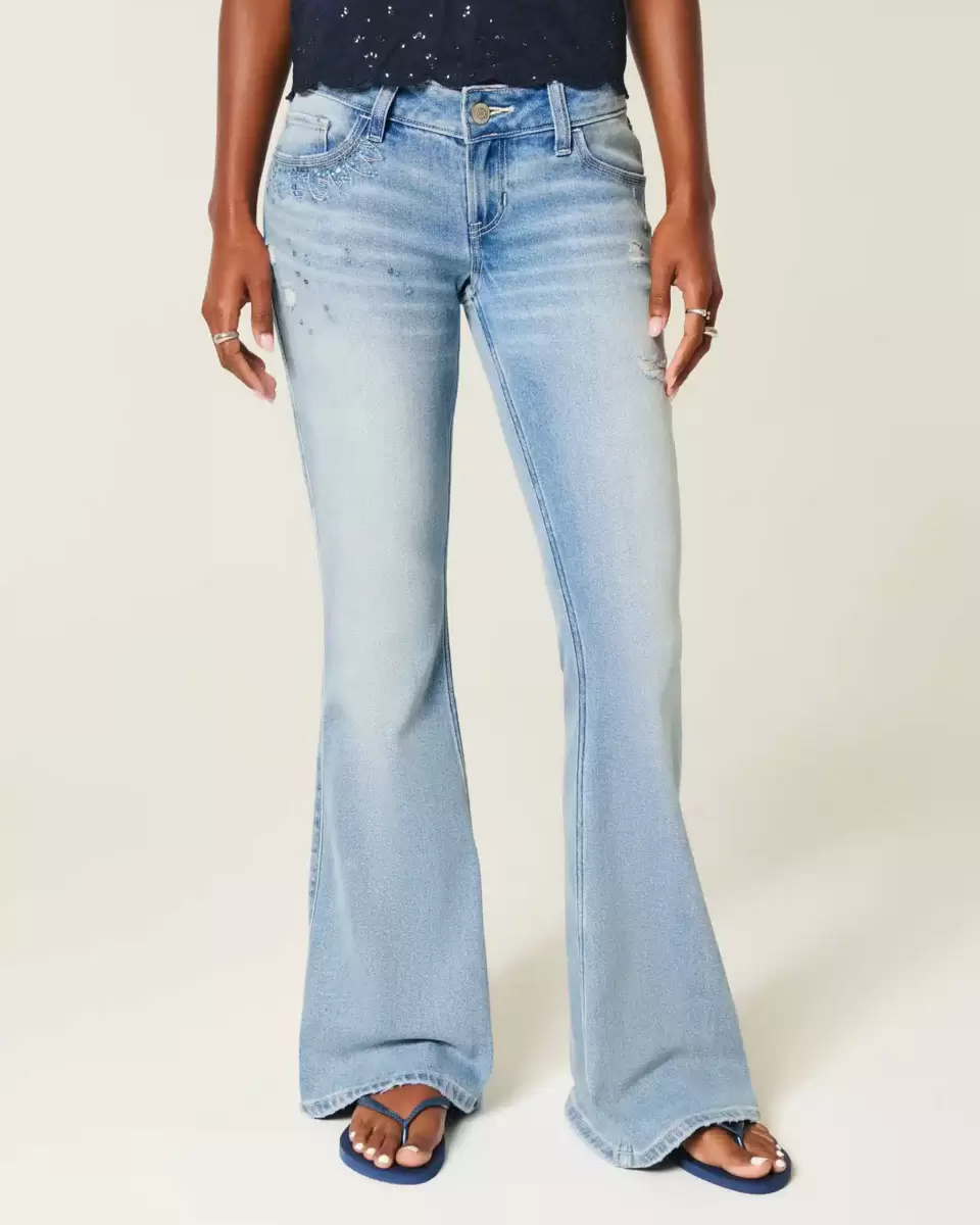Jean confortable en denim vintage stretch, avec une taille ultra basse et un ourlet évasé. Délavage léger avec effet délavé et effet moustaches, détails vieillis, broderies et paillettes. Importé.