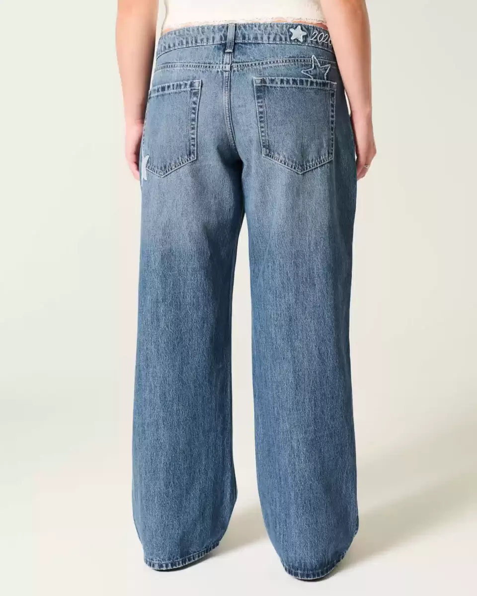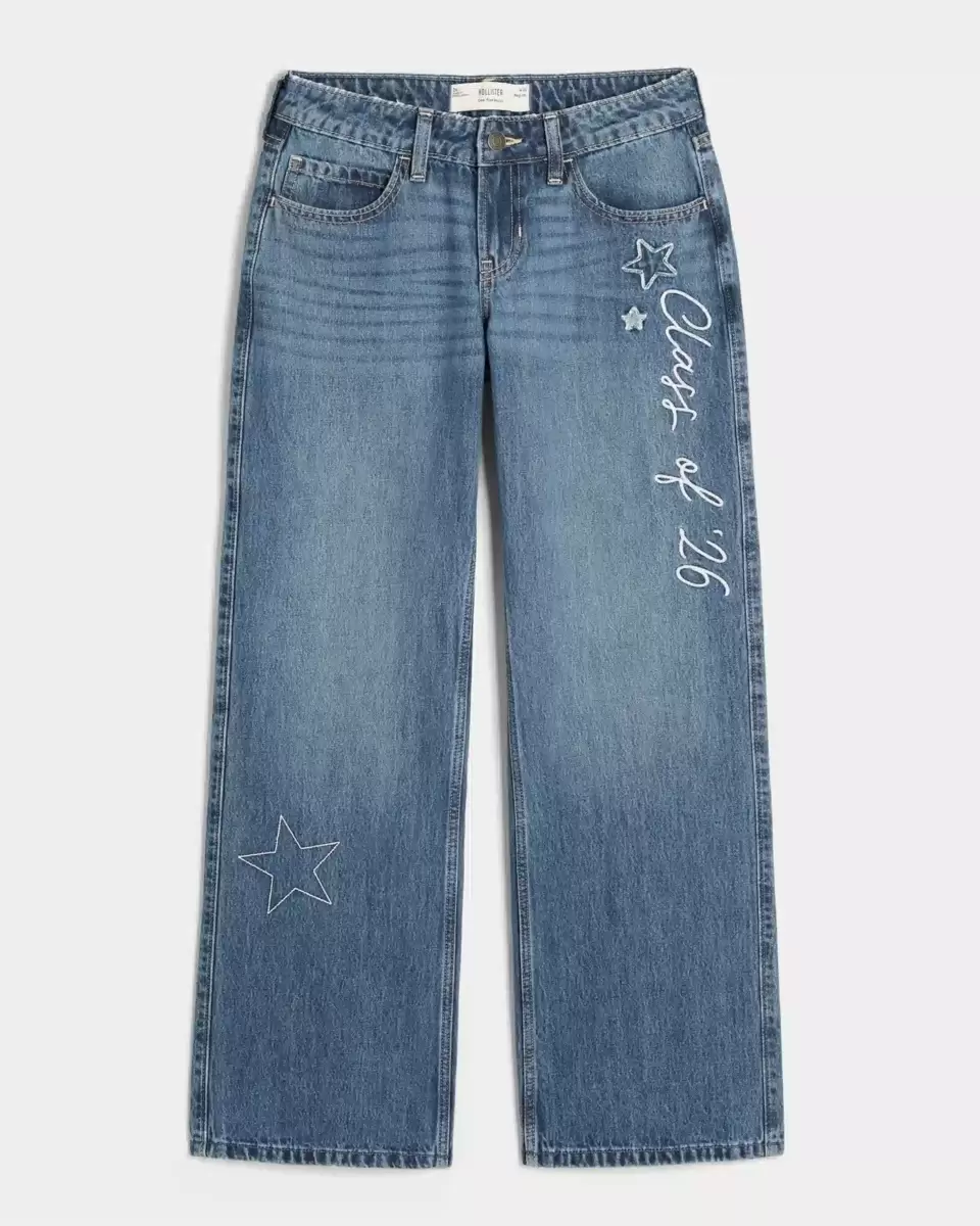 Jean confortable en denim, taille basse flatteuse et jambe ample, orné d’une broderie graphique « Class of ’26 » avec application. Délavage foncé avec décoloration et moustaches. Importé.