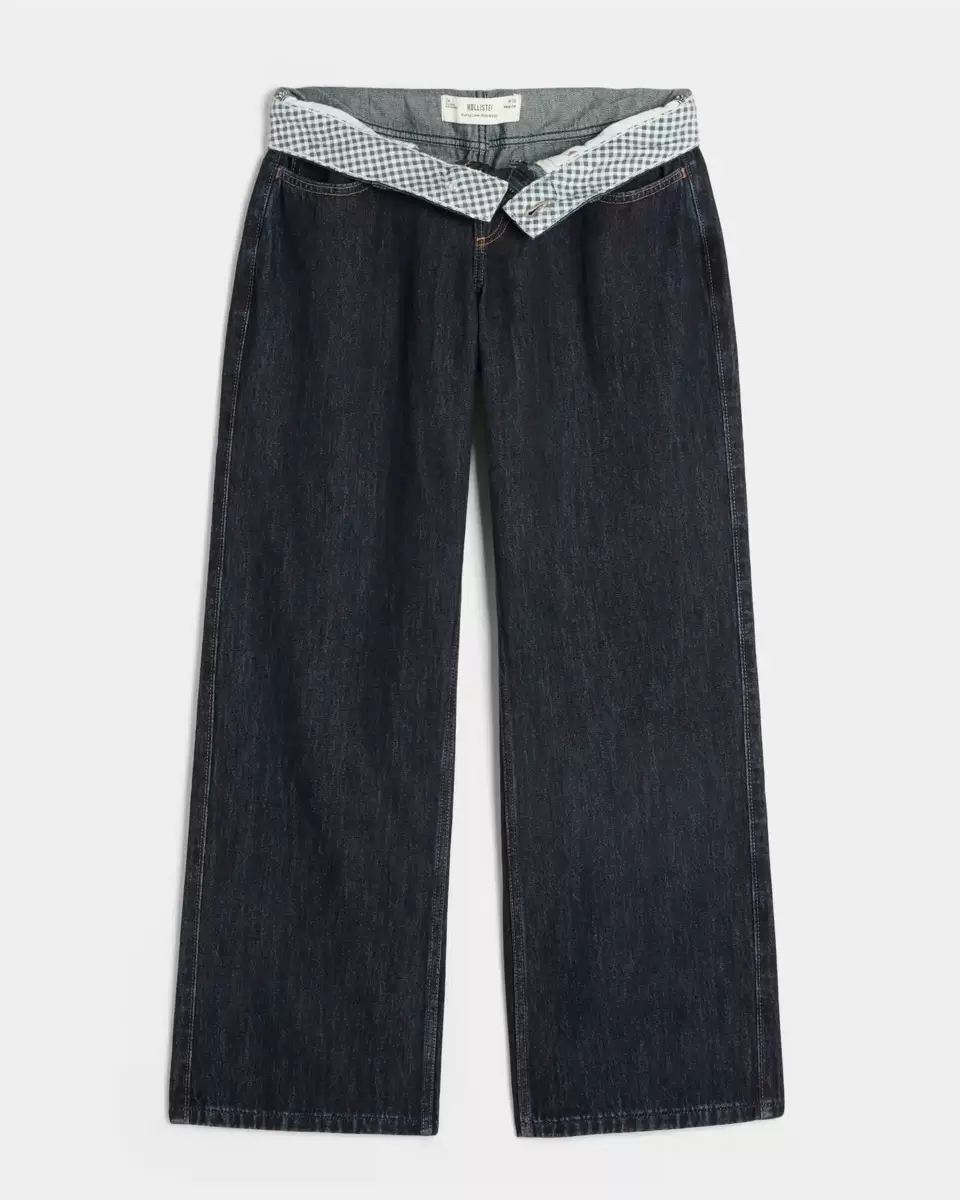 Jean confortable en denim avec taille basse repliée et motif intérieur, jambe ample, délavage foncé. Importé.