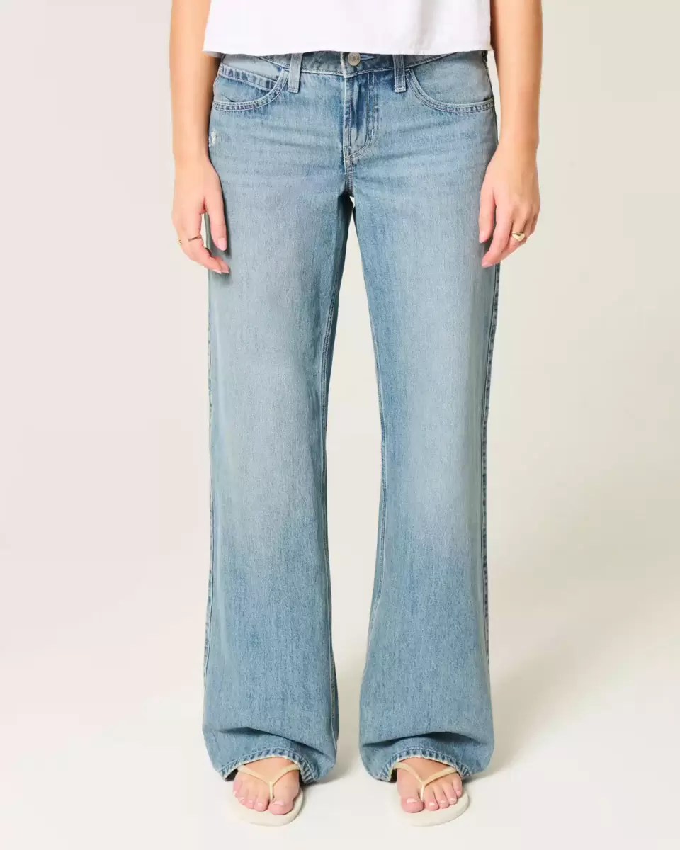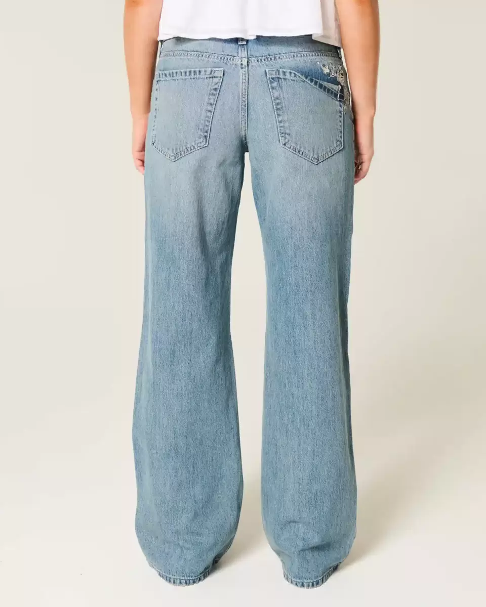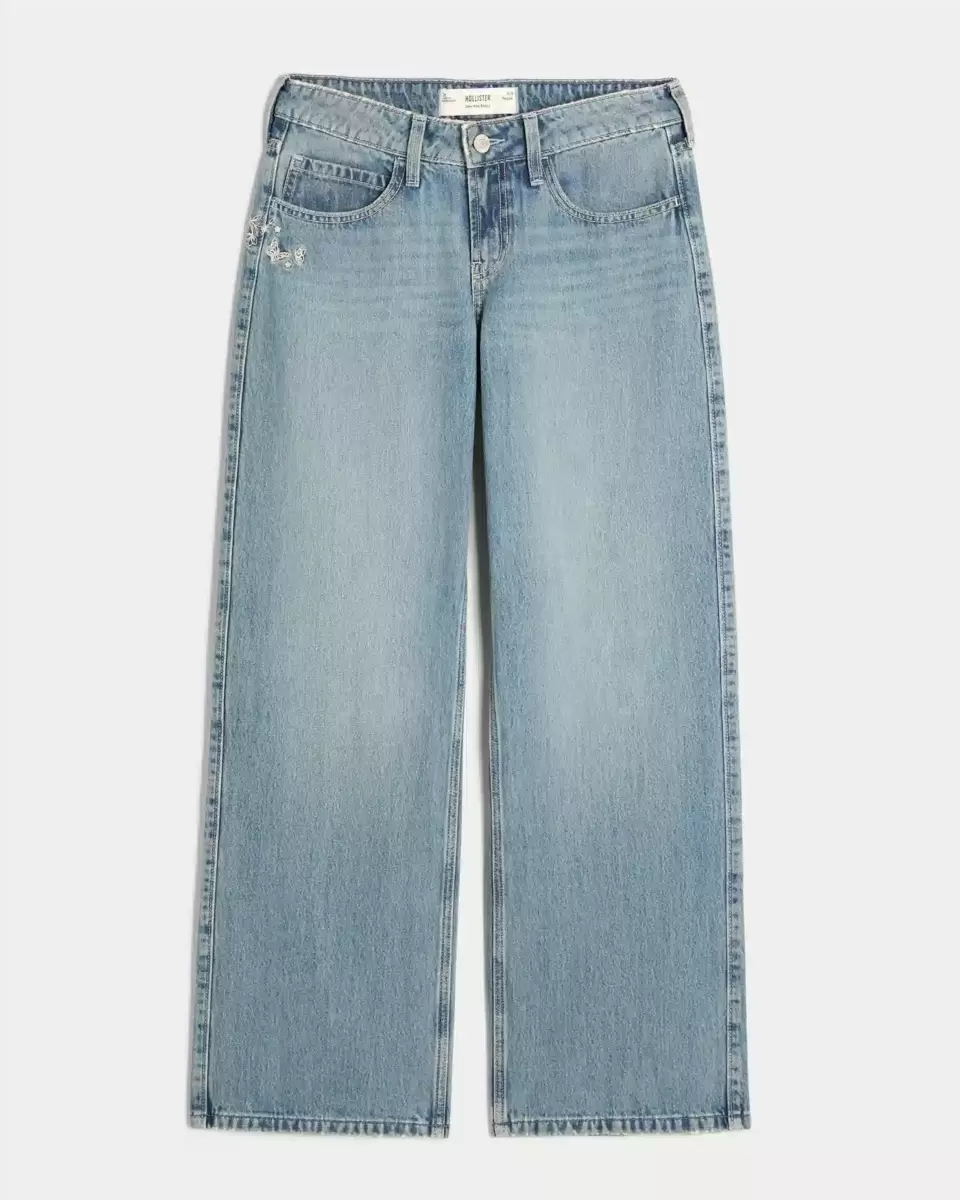Jean confortable en denim délavé moyen, coupe ample et taille basse flatteuse. Motifs papillons brodés sur le côté droit et la poche arrière. Poche arrière rabattable, décoloration et effet moustaches. Importé.