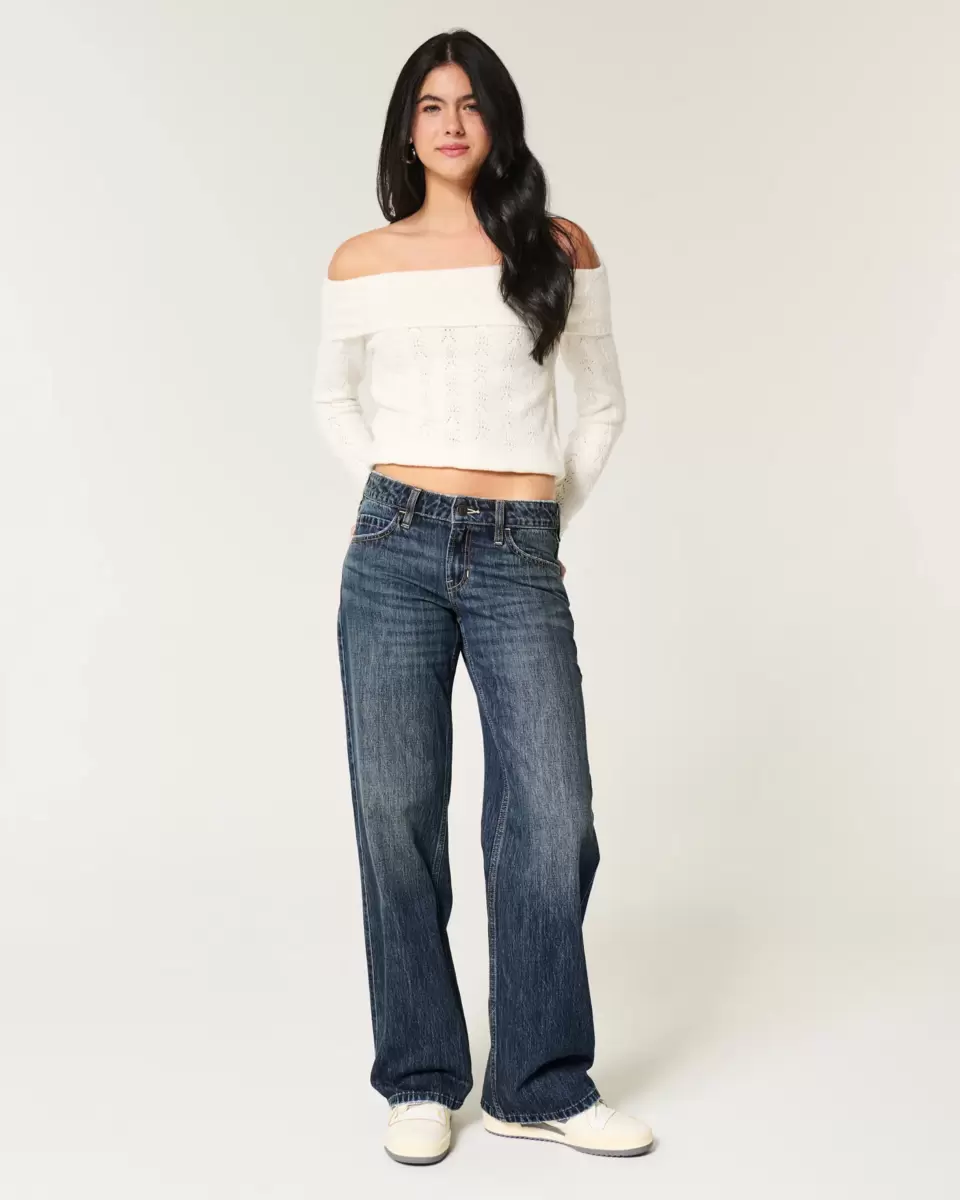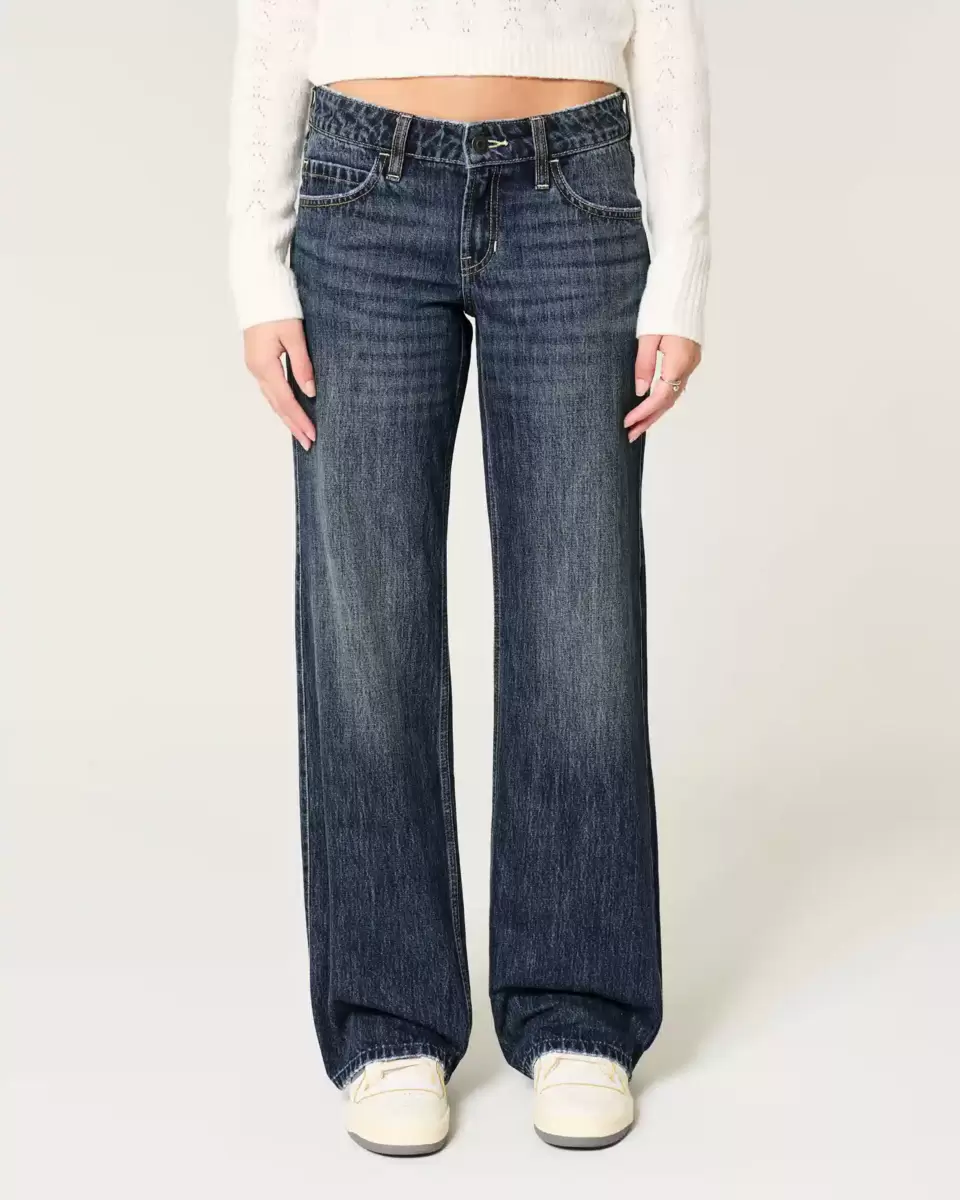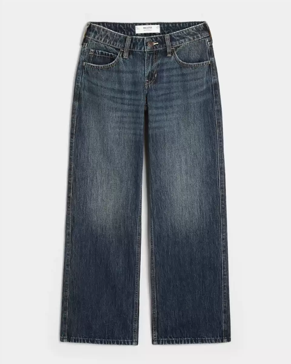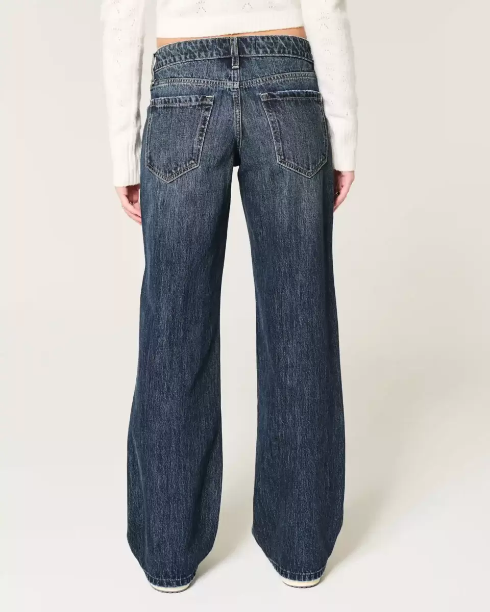 Jean ultra confortable au délavage foncé avec décoloration et effet moustaches. Taille basse flatteuse et jambe ample. Importé.