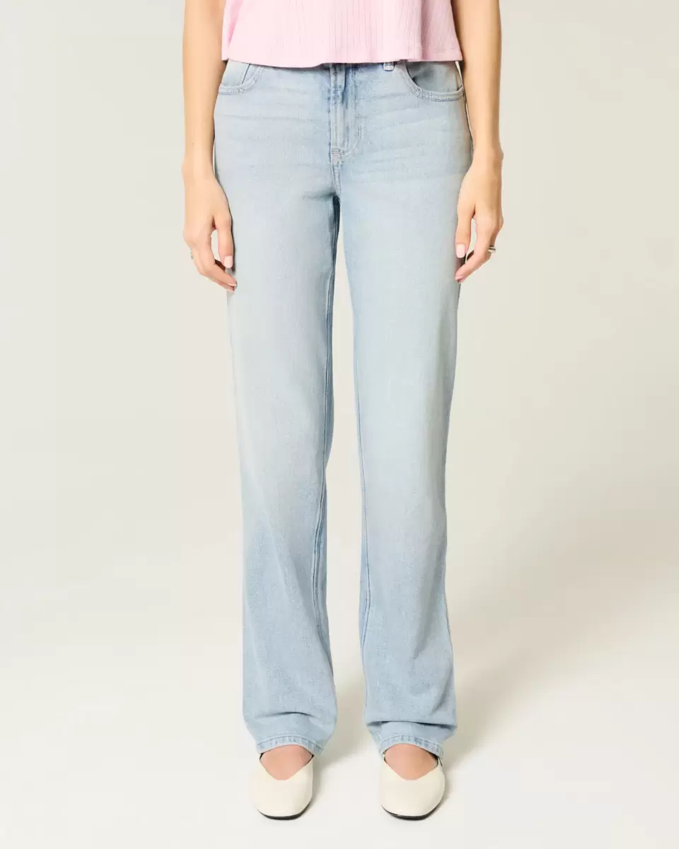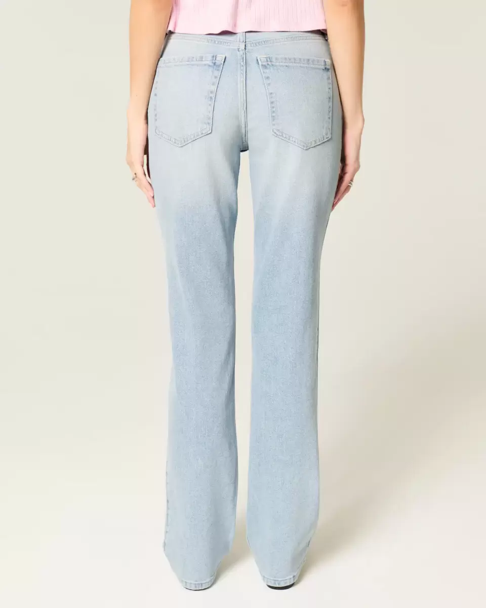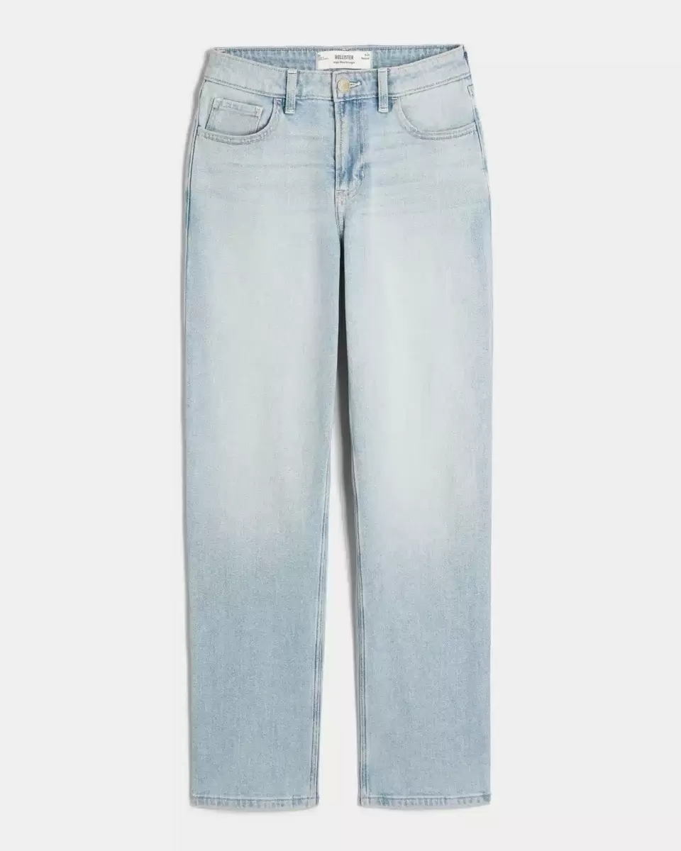 Jean confortable en denim légèrement délavé, avec une taille haute flatteuse et une jambe droite. Décoloration et effet moustaches. Importé.