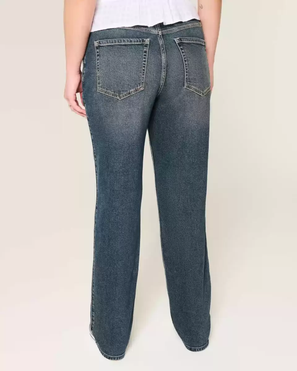 Jean confortable en denim extensible vintage, délavage foncé, avec une taille haute flatteuse et une jambe droite. Décoloration et effet moustaches. Importé.