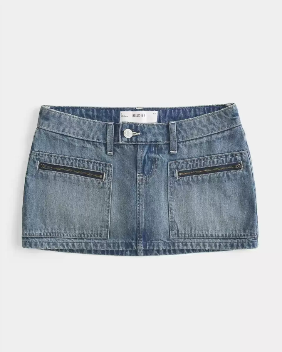 Une jolie mini-jupe en jean avec une taille ultra basse et un short en maille dissimulé. Délavage moyen avec décoloration et moustaches. Importé.