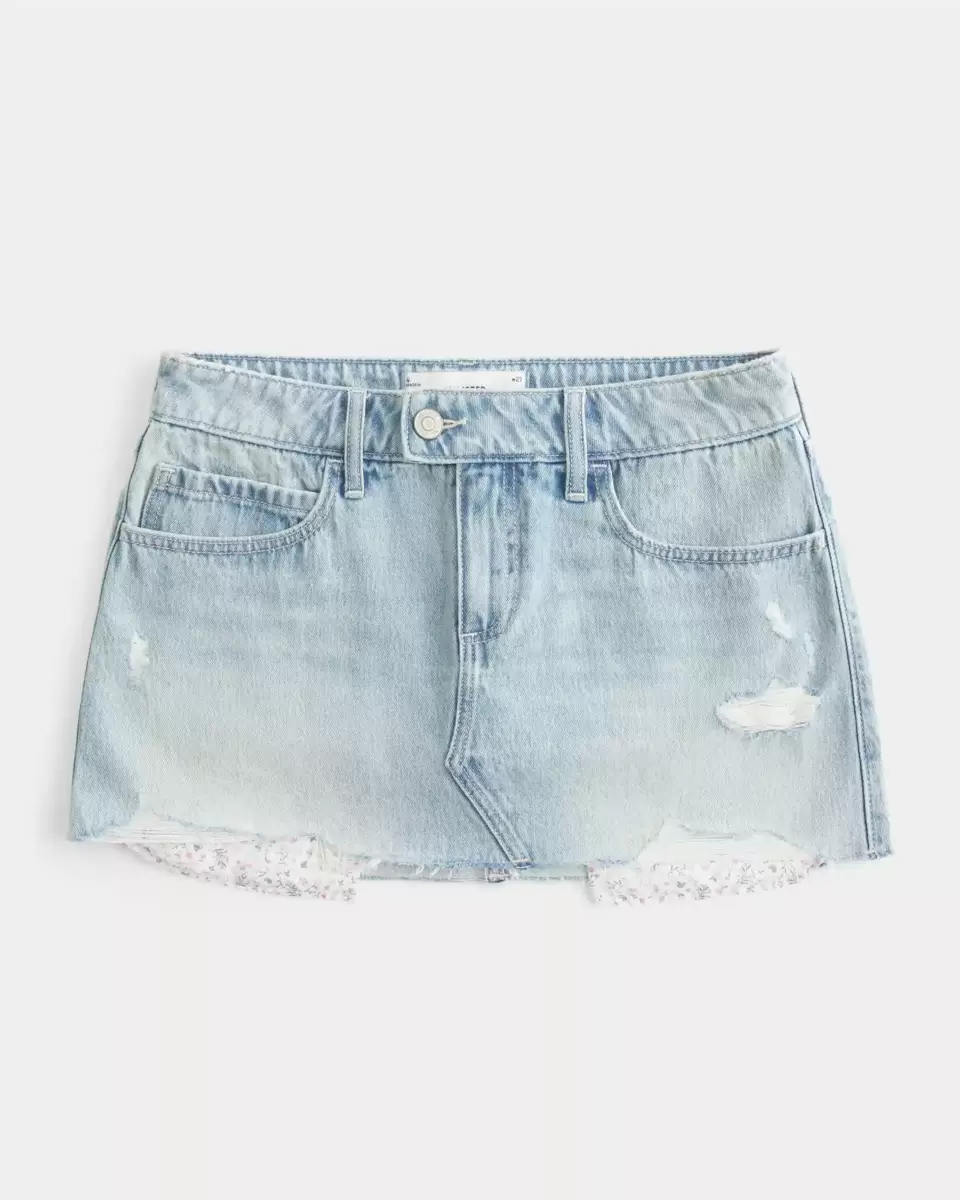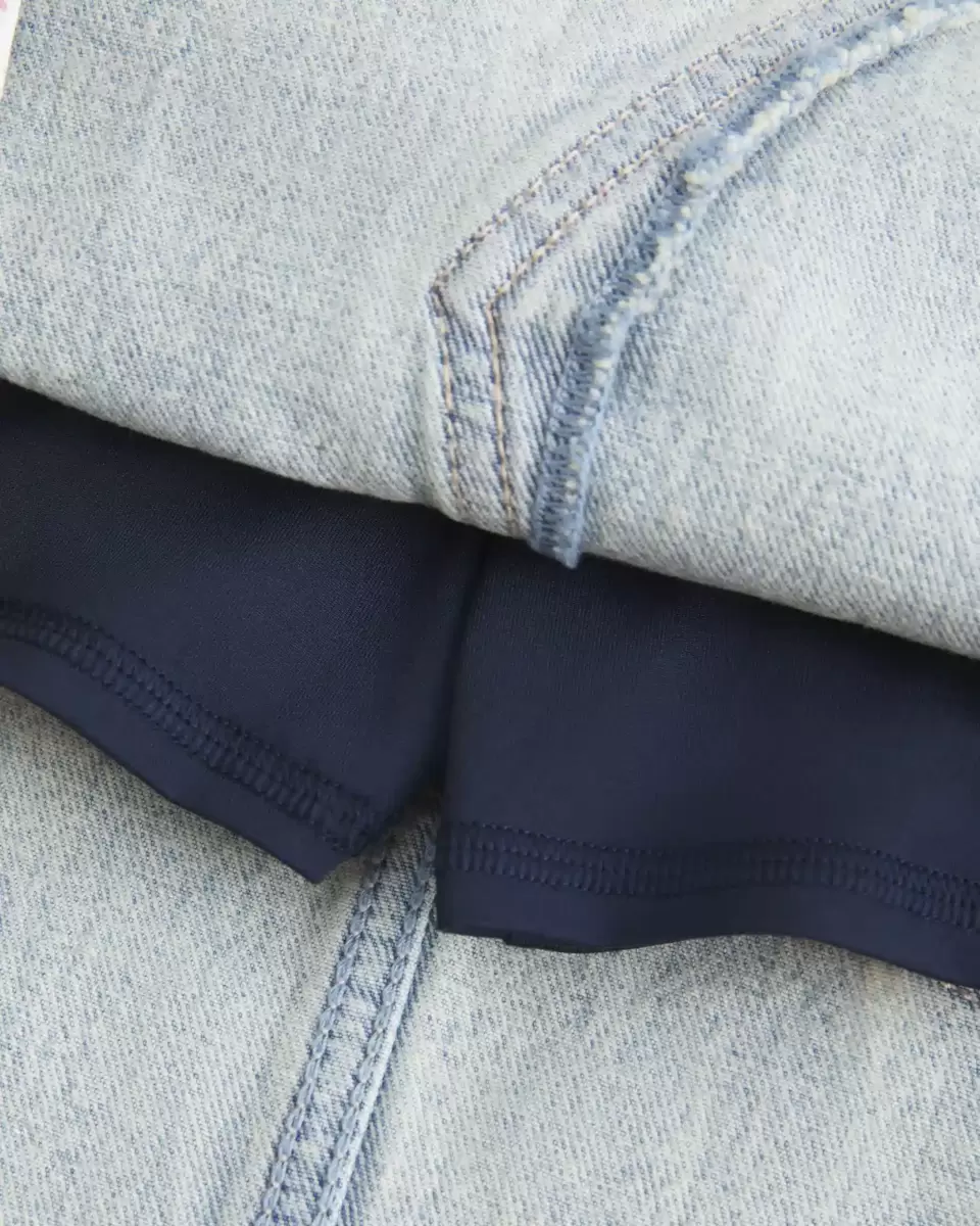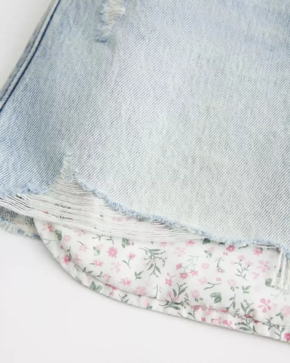 Une jolie mini-jupe en jean avec une taille basse et un short en maille dissimulé. Délavage clair avec poches à imprimé floral visibles. Importé.
