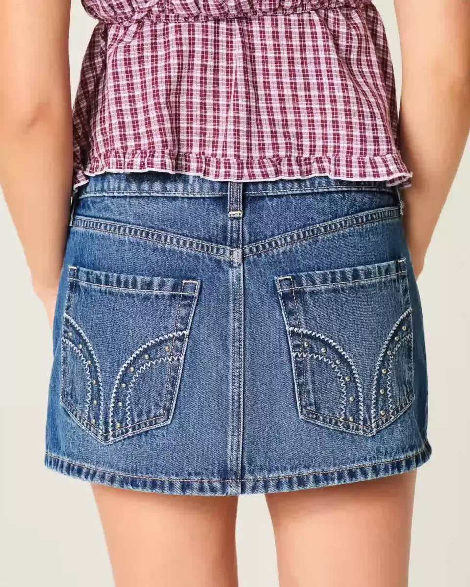 Une jolie mini-jupe en jean, dotée d’une taille basse et d’un short en maille dissimulé. Délavage moyen avec décoloration et effet moustaches. Détails cloutés sur les poches arrière. Importé.