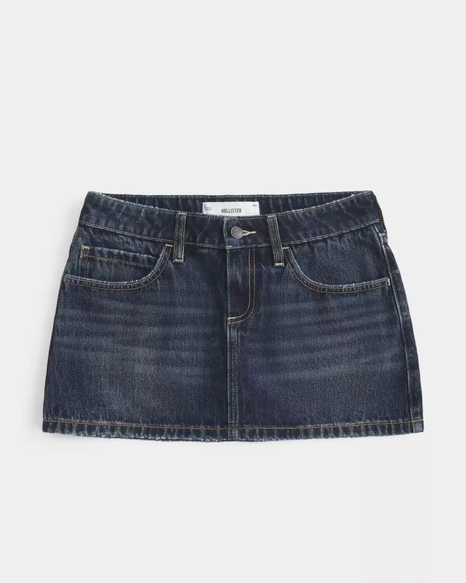 Une jolie mini-jupe en jean avec une taille basse et un short en maille dissimulé. Délavage foncé avec décoloration et moustaches. Importé.