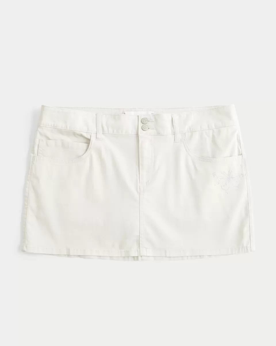 Une jolie mini-jupe en sergé avec une taille basse et un short en maille dissimulé. Joli motif papillon brillant sur la poche gauche. Importé.