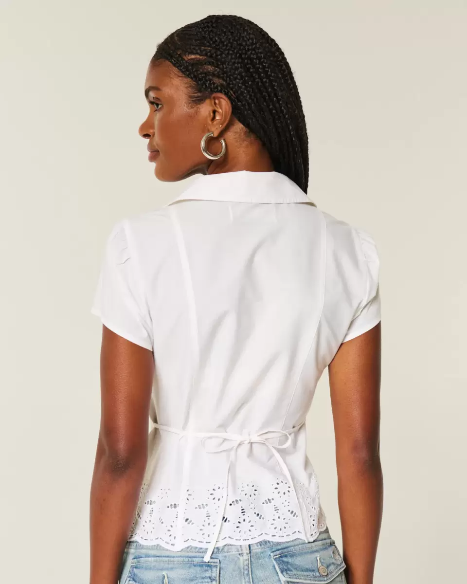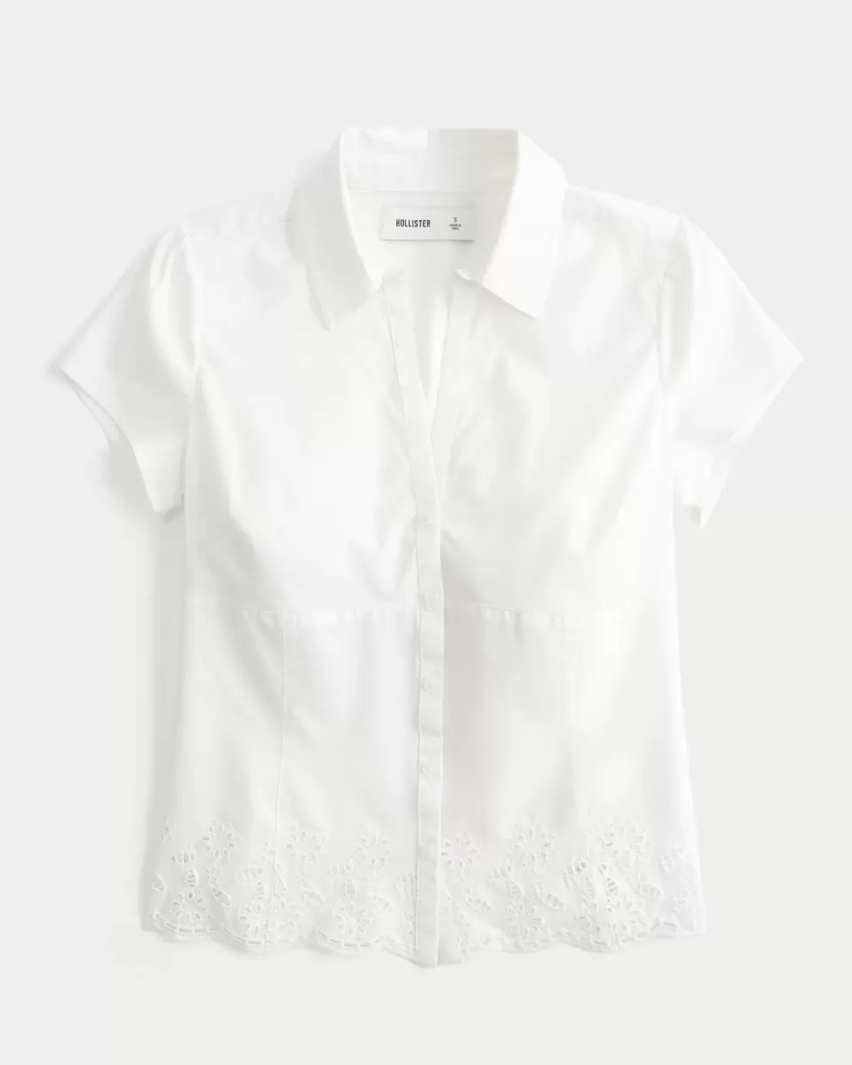 Cette chemise douce à manches courtes d’inspiration bohème est ornée d’une broderie à œillets le long de l’ourlet. Col en popeline extensible. Coupe ajustée. Importé.