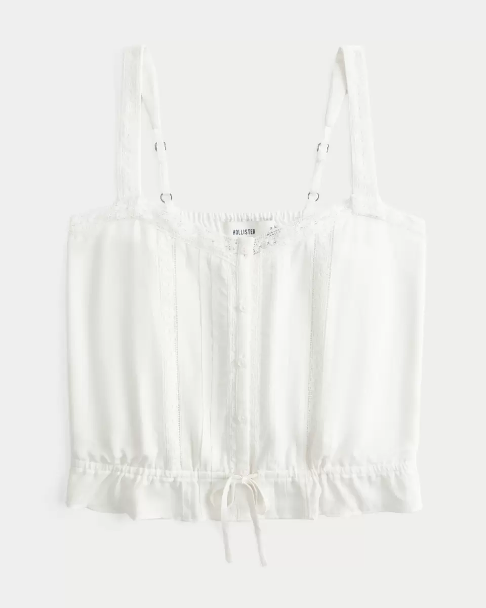Un joli chemisier ultra doux d’inspiration bohème avec des détails en dentelle, des plis nervurés et une taille cintrée avec un lien. Bretelles réglables, parfait pour une tenue habillée ou décontractée ! Importé.