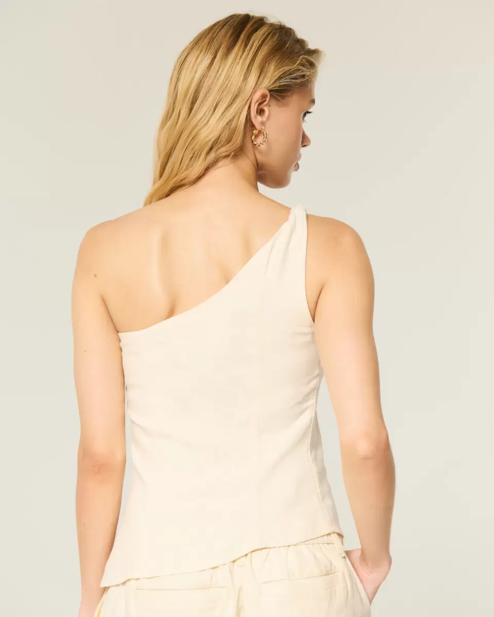 Un joli haut en mélange de lin doux, conçu avec une silhouette asymétrique à une épaule. Détail torsadé sur la bretelle et ourlet asymétrique.