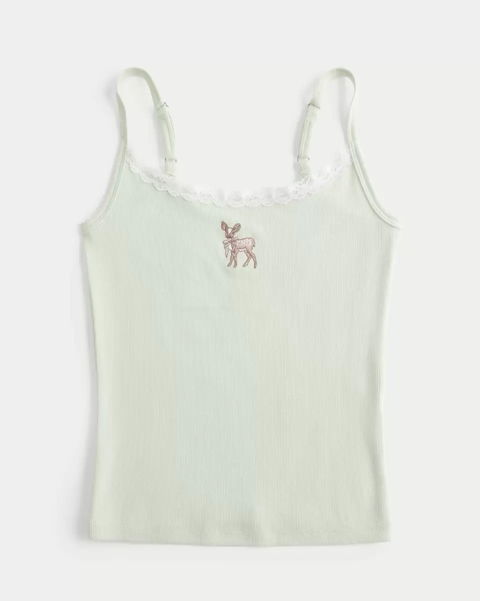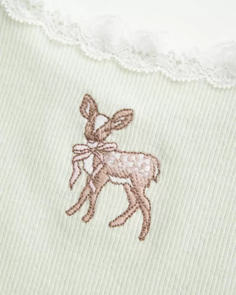Ce débardeur mignon et confortable est orné d’une jolie bordure en dentelle à l’encolure et d’un motif cerf brodé. Tissu côtelé ultra doux, bretelles réglables. Coupe ajustée. Importé.