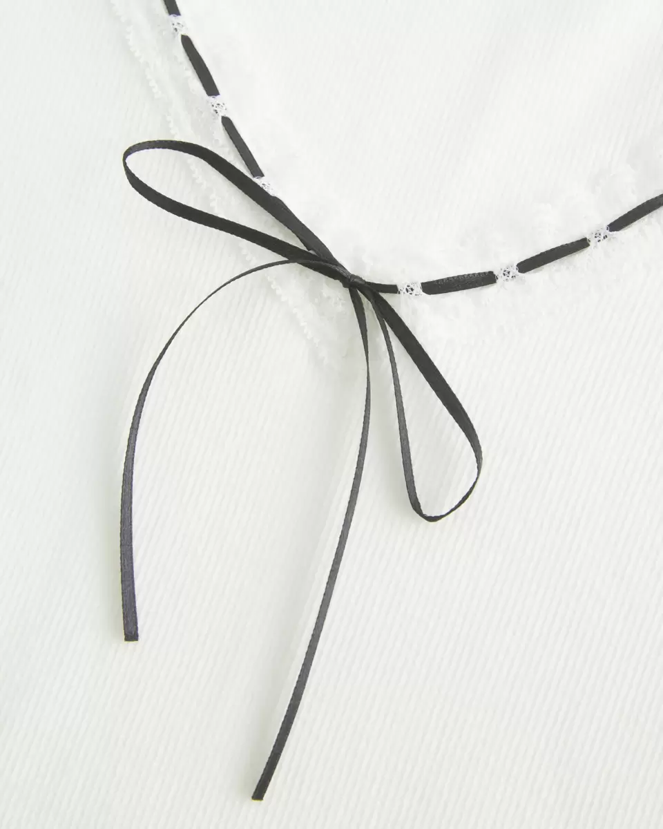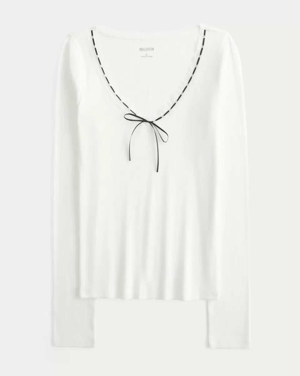 Super doux et confortable, ce haut présente une jolie bordure en dentelle le long de l’encolure avec un lien entrelacé. Manches longues. Importé.