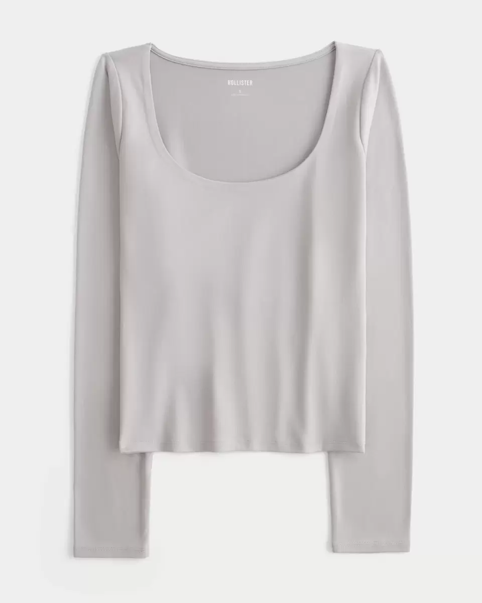 Un haut mignon et confortable en tissu ultra doux, sans coutures. Encolure dégagée, manches longues. Coupe ajustée. Importé.