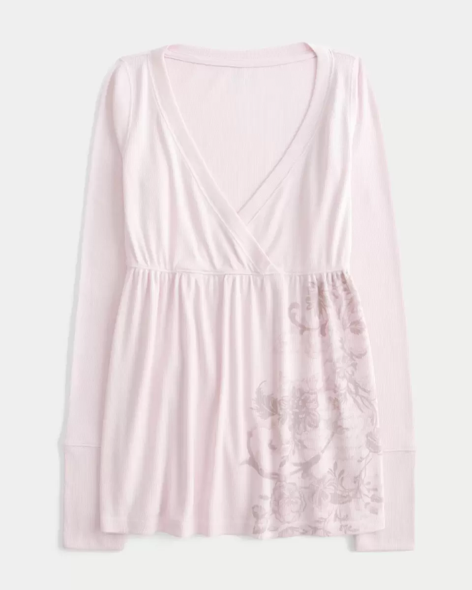 Ce joli haut babydoll ultra doux présente un imprimé floral. Manches longues, décolleté en V cache-cœur et ourlet fluide. Coupe facile. Importé.