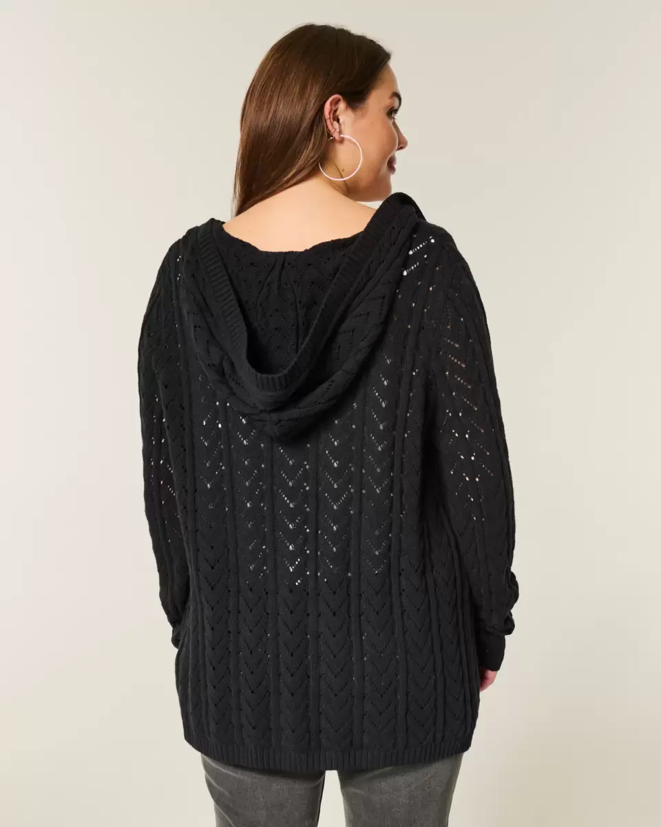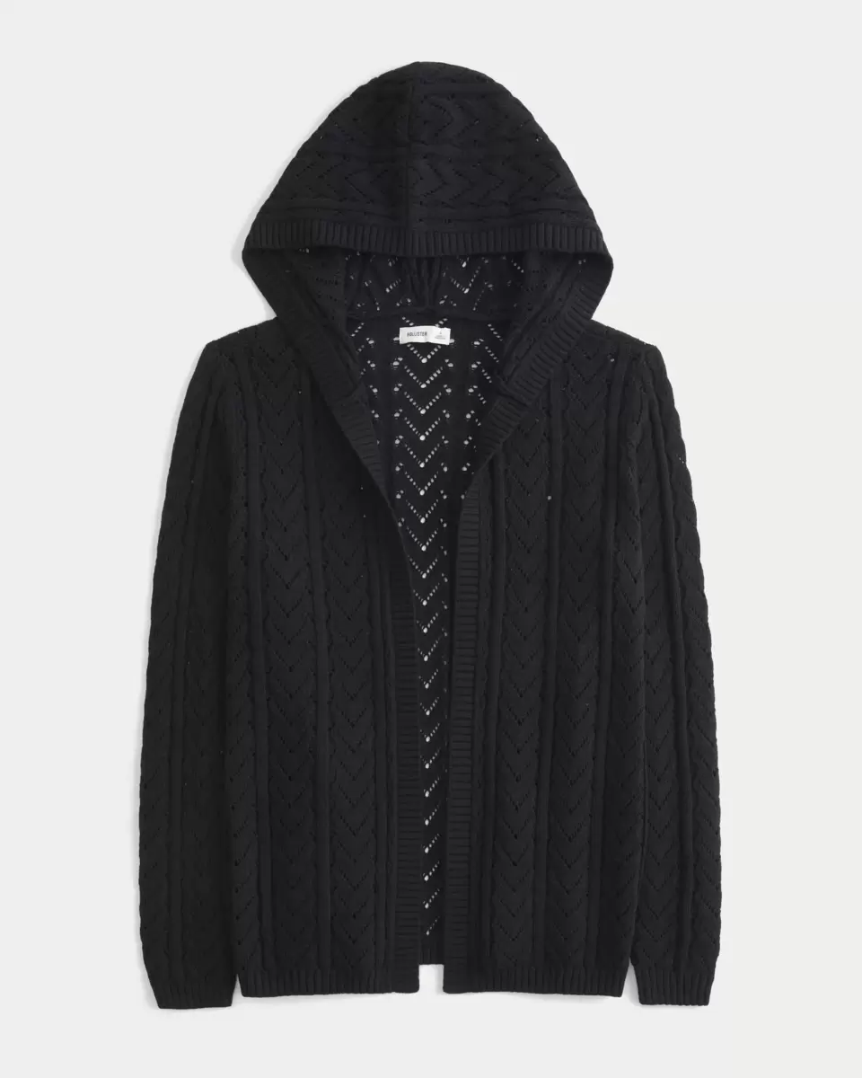 Un cardigan à capuche confortable et ultra doux, avec des motifs surpiqués et des bords côtelés. Sans fermeture, manches longues. Coupe ajustée. Importé.