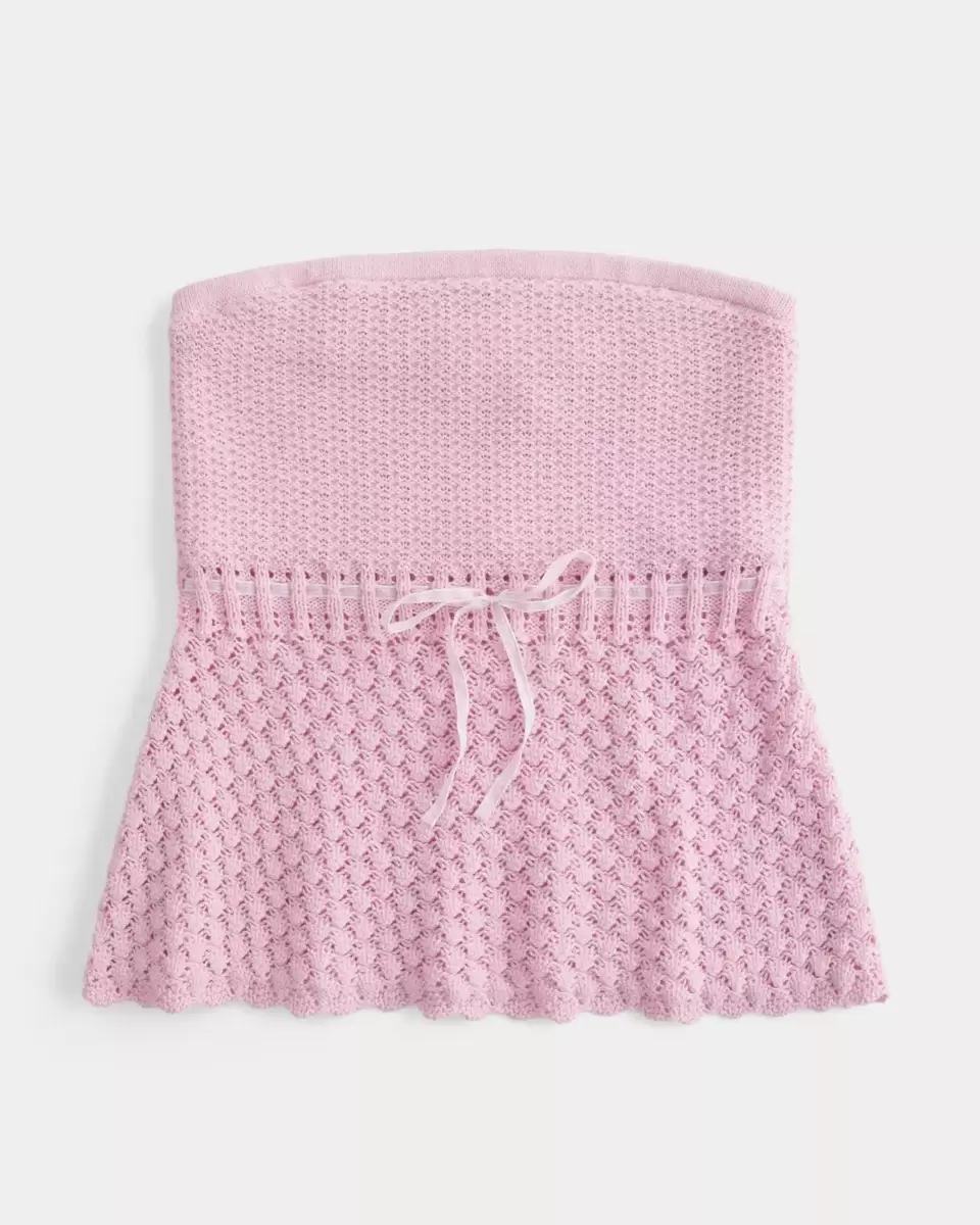 Confortable et ultra doux, ce haut tube présente des motifs crochetés et un lien à nouer à la taille. Sans bretelles. Importé.