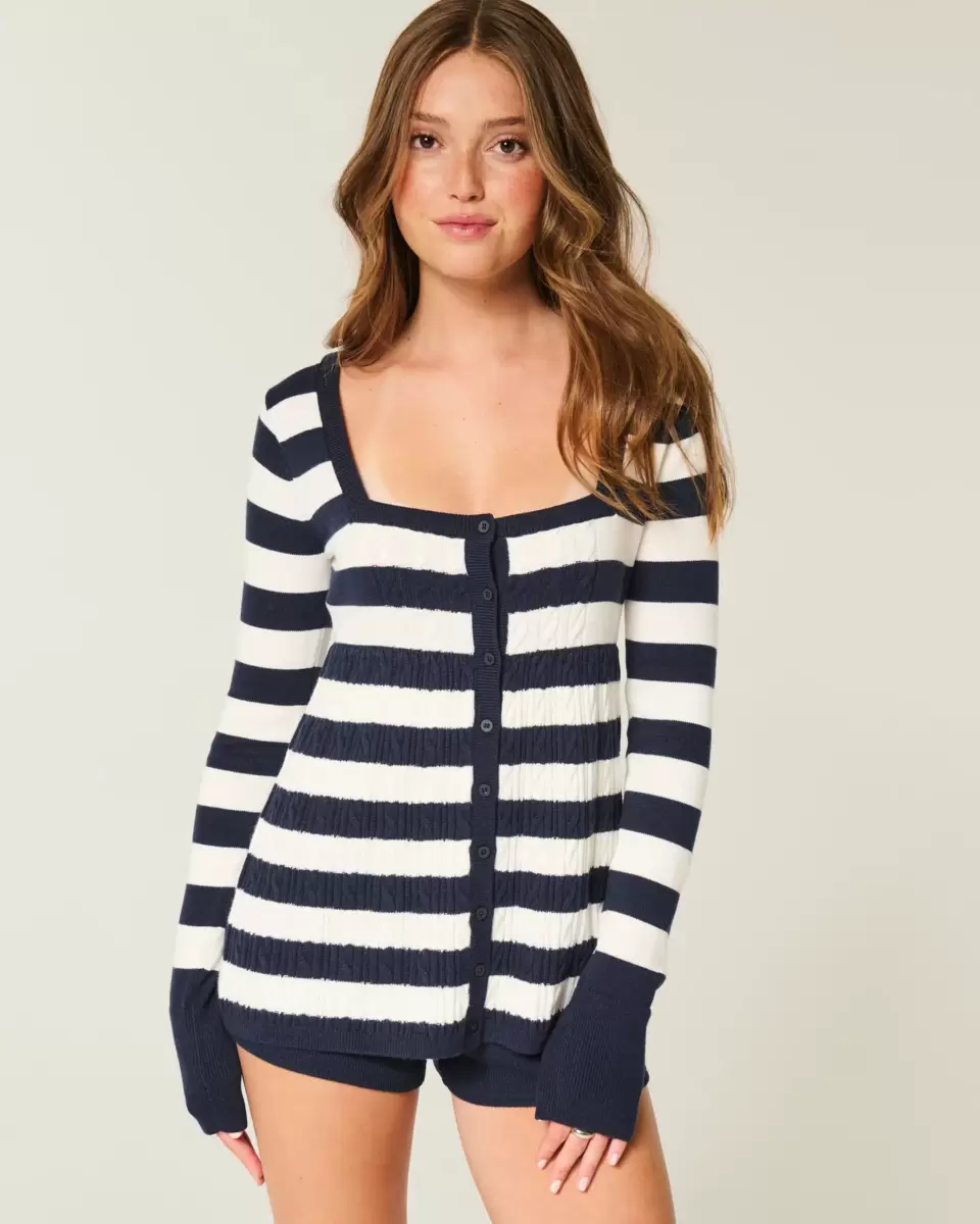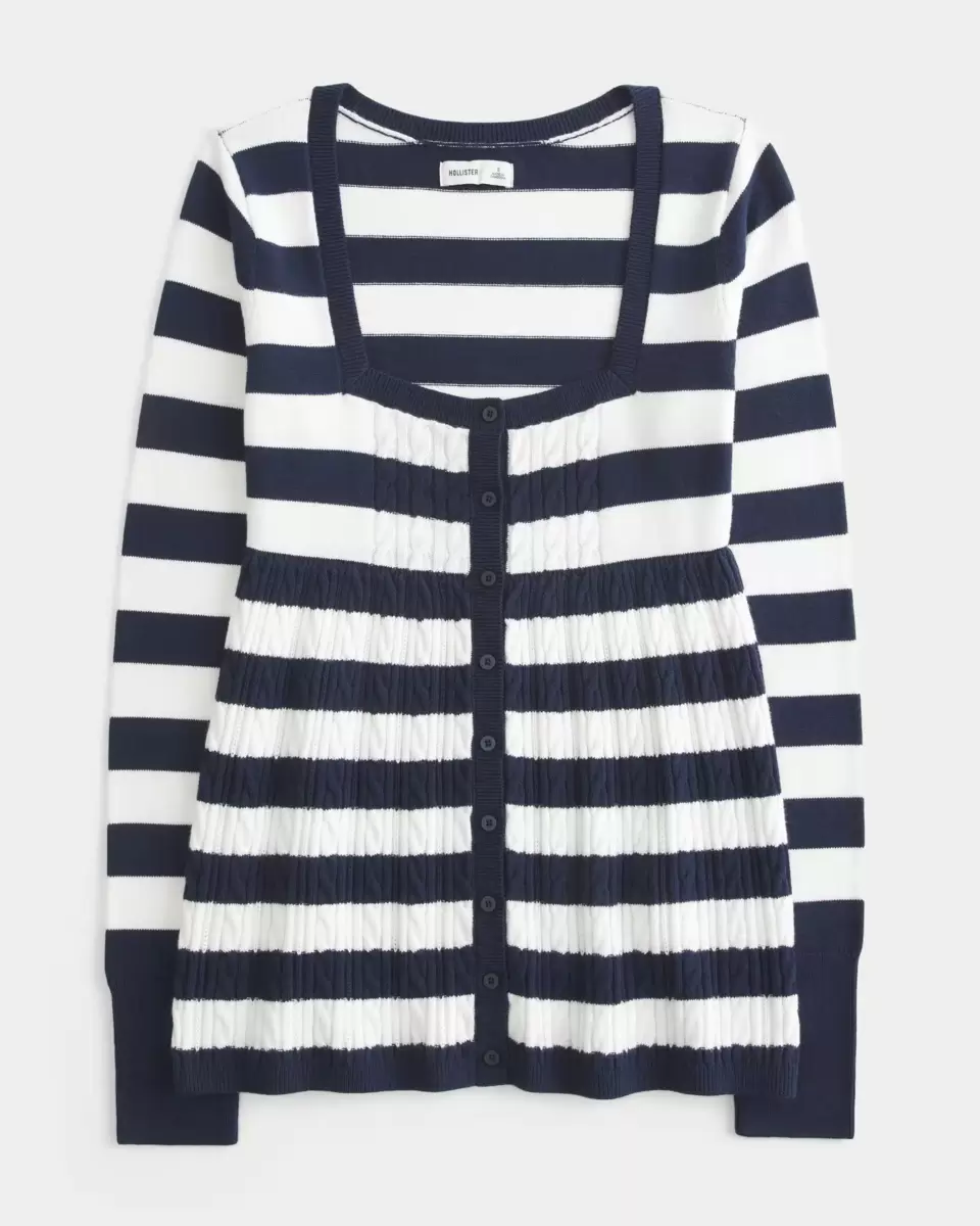 Parfait à superposer avec un débardeur ou porté seul, ce pull à manches longues présente une encolure carrée et une jolie silhouette babydoll d’inspiration années 2000. Fermeture boutonnée sur le devant, motifs torsadés, coupe plus longue. Coupe facile. Importé.