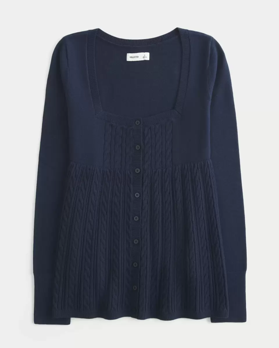 Parfait à superposer avec un débardeur ou porté seul, ce pull à manches longues présente une encolure carrée et une jolie silhouette babydoll d’inspiration années 2000. Fermeture boutonnée sur le devant, motifs torsadés, coupe plus longue. Coupe facile. Importé.