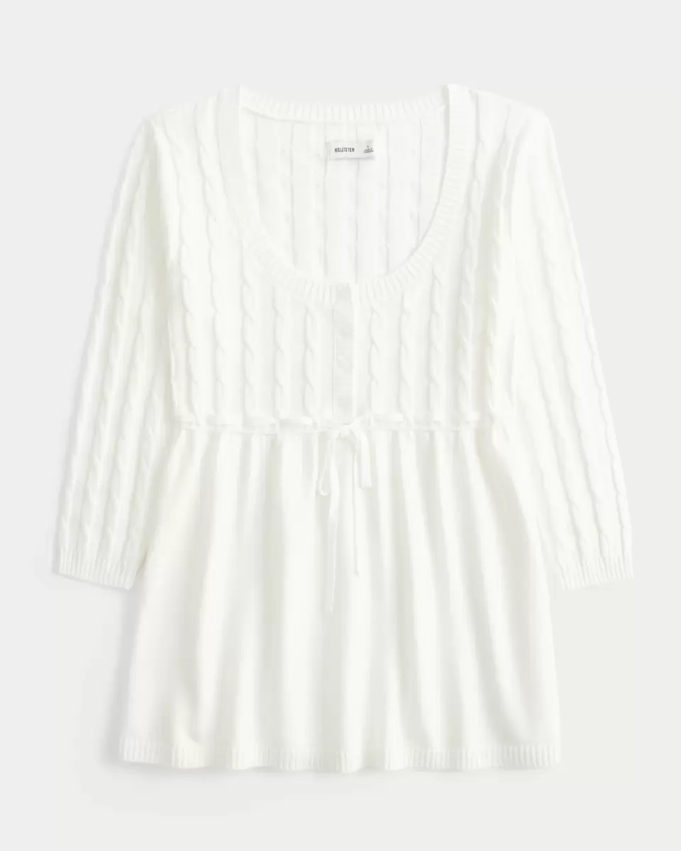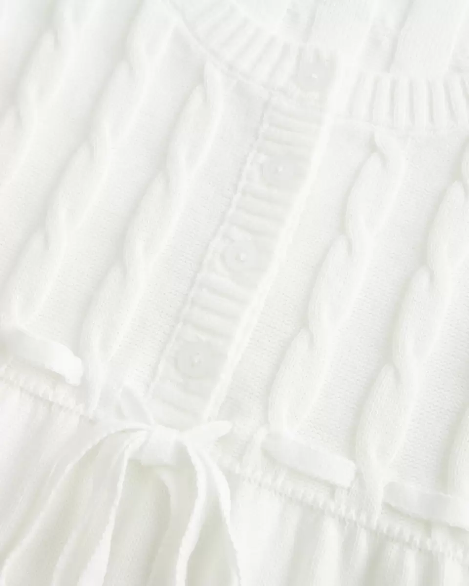 Ce pull douillet et ultra doux présente une jolie silhouette babydoll. Lien à nouer à la taille, bords côtelés, manches longues, motifs torsadés et boutons centraux. Importé.