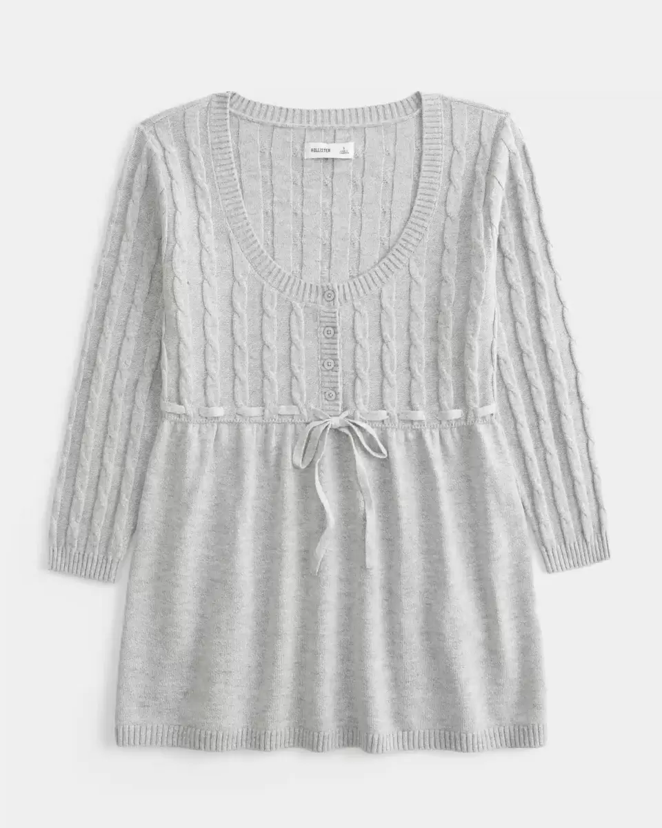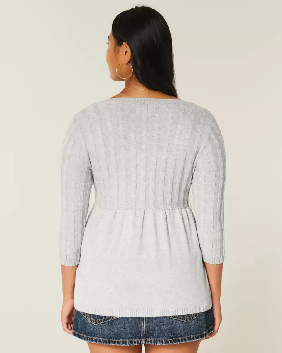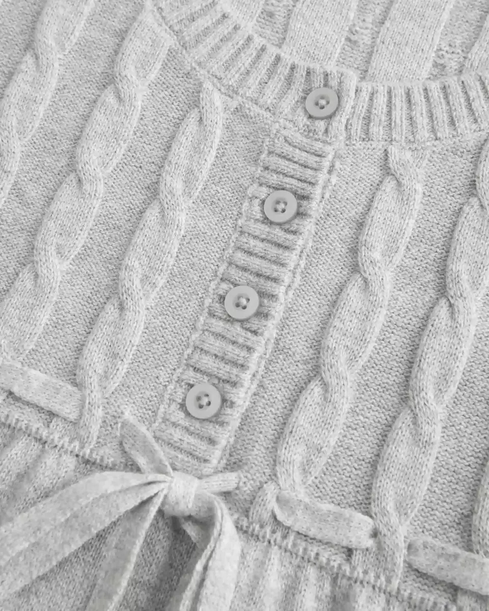 Ce pull douillet et ultra doux présente une jolie silhouette babydoll. Lien à nouer à la taille, bords côtelés, manches longues, motifs torsadés et boutons centraux. Importé.