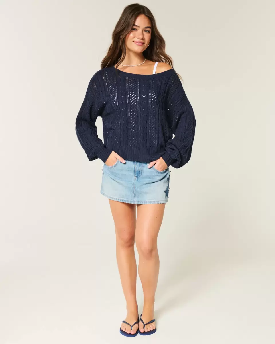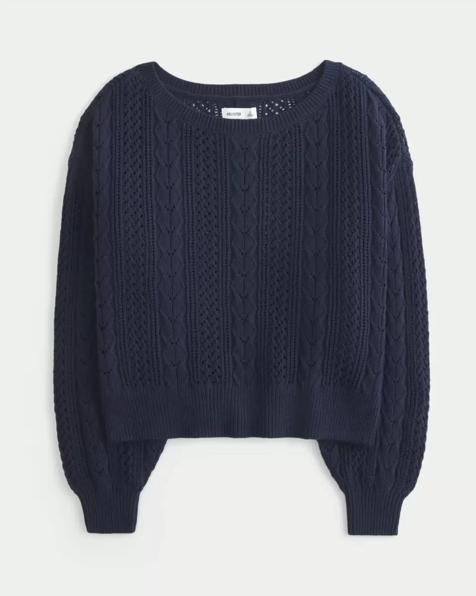 Ce pull ultra doux et confortable présente des motifs torsadés à mailles ouvertes. Bordures côtelées, encolure décontractée et manches longues. Importé.