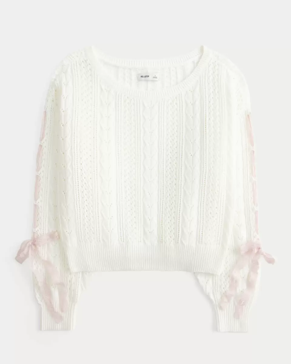 Ce pull ultra doux et confortable est orné de jolis liens en dentelle aux manches et de motifs torsadés à mailles ouvertes. Bordures côtelées, encolure décontractée et manches longues. Importé.