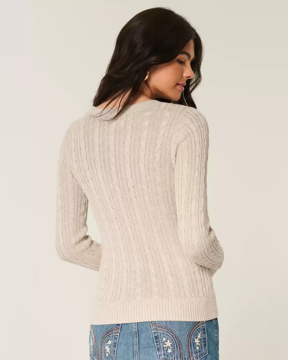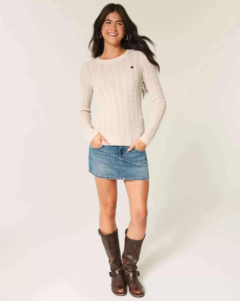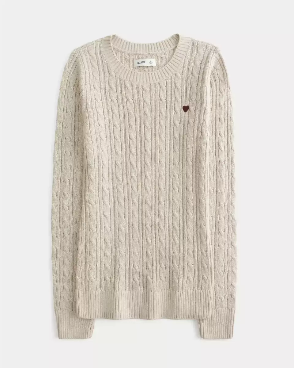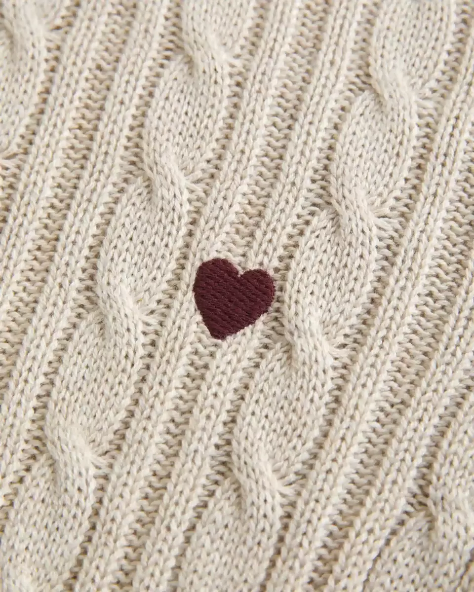 Pull en maille torsadée confortable et ultra doux avec un cœur brodé sur la poitrine gauche. Encolure ras du cou, longueur plus longue, bords côtelés. Coupe ajustée. Importé.