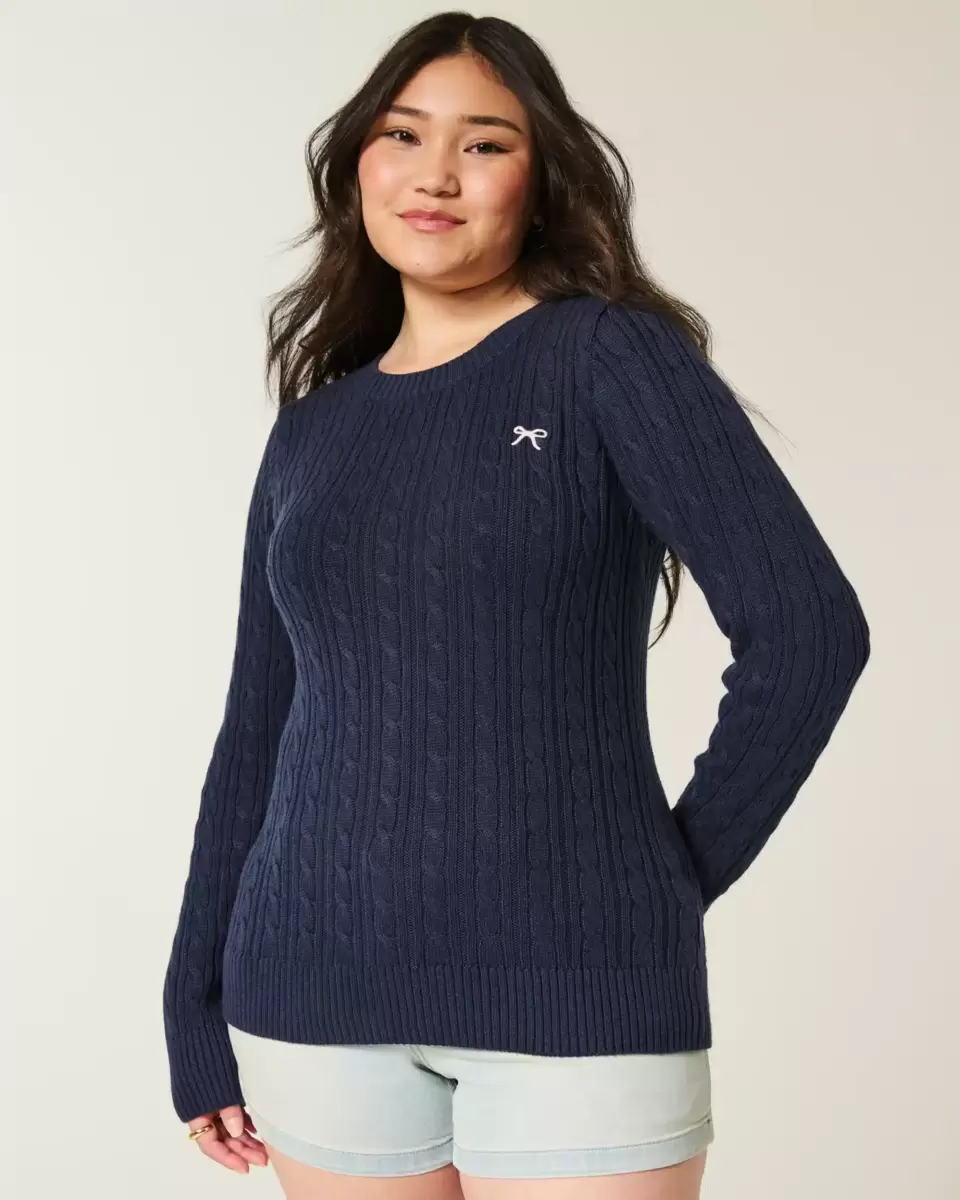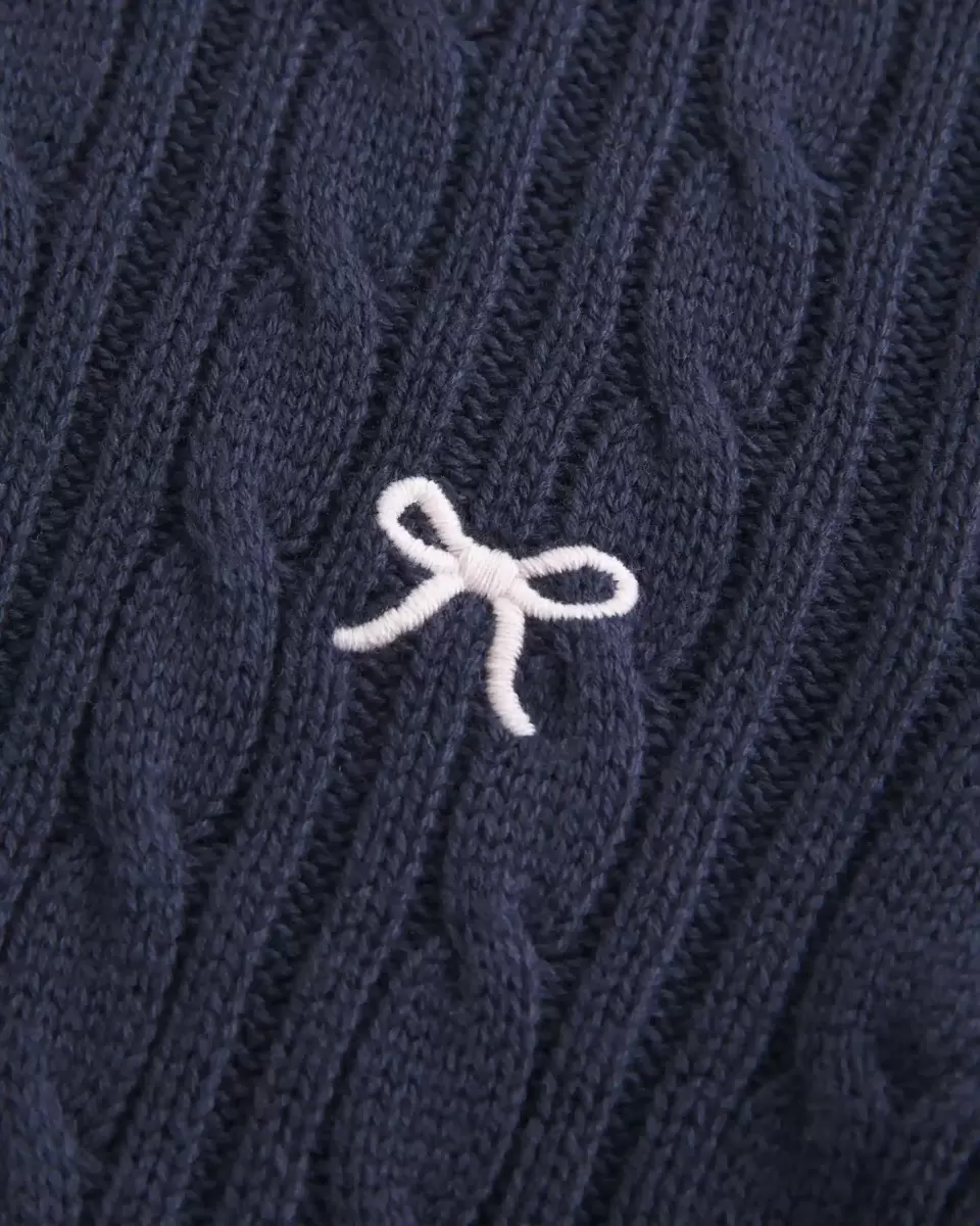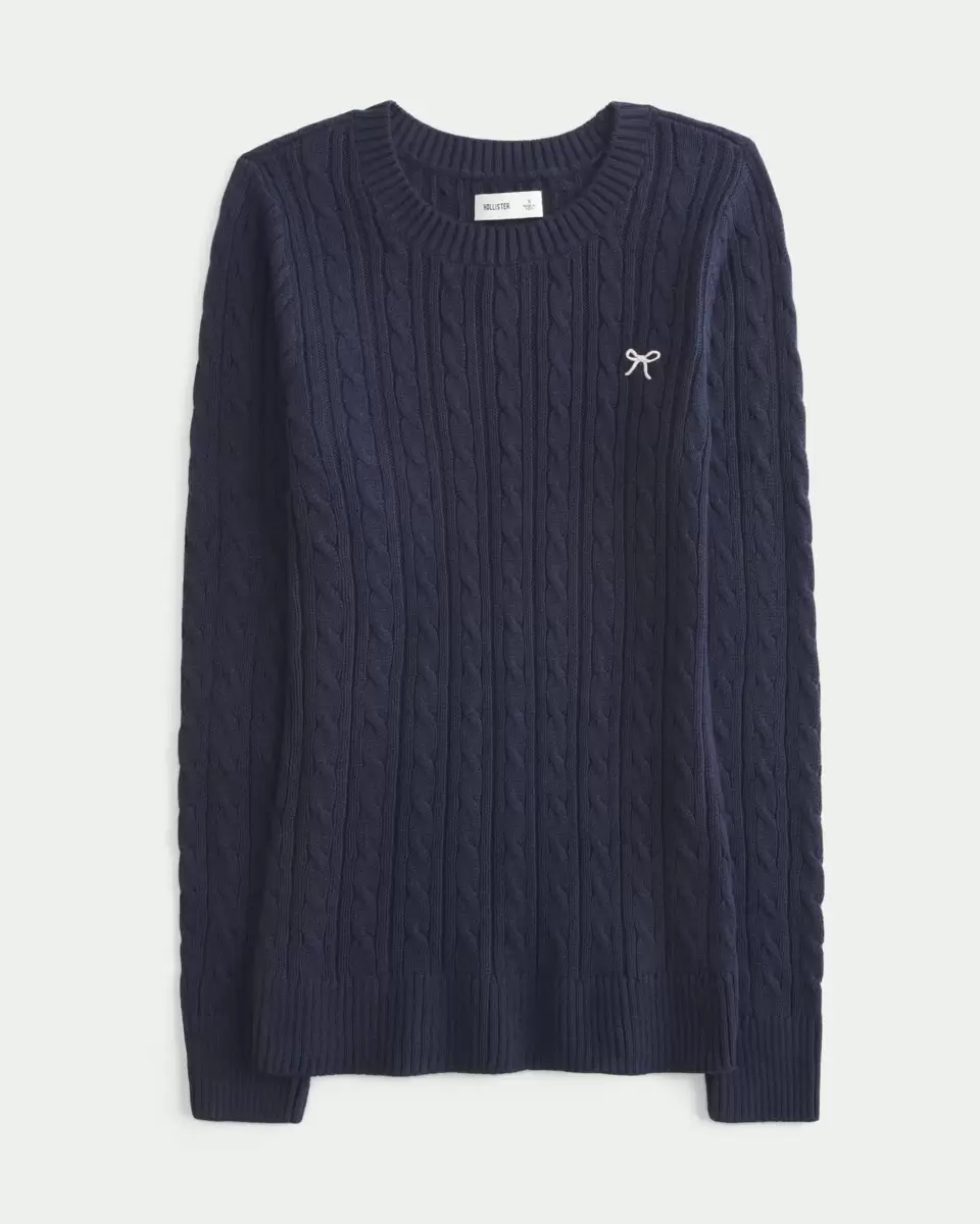 Pull en maille torsadée confortable et ultra doux, orné d’un nœud brodé sur la poitrine gauche. Encolure ras du cou, longueur plus longue, bords côtelés. Coupe ajustée. Importé.