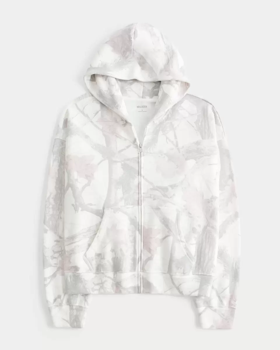 Ce sweat à capuche en polaire ultra doux arbore un motif camouflage intégral. Fermeture éclair intégrale, poches avant, capuche et manches longues. Coupe oversize. Importé.