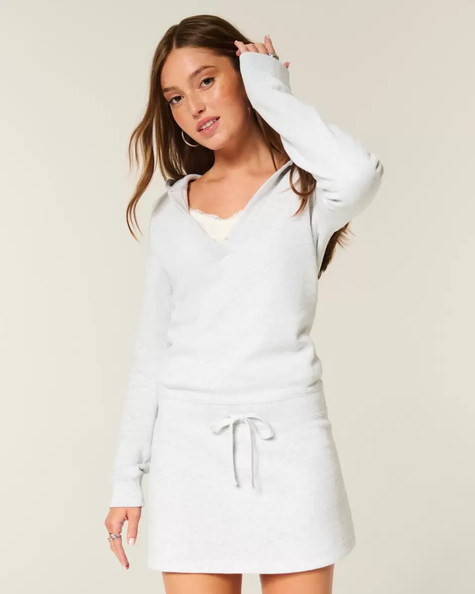 Confortable et ultra douce, cette robe polaire présente un décolleté en V et un cordon de serrage à la taille. Manches longues et capuche. Importée.