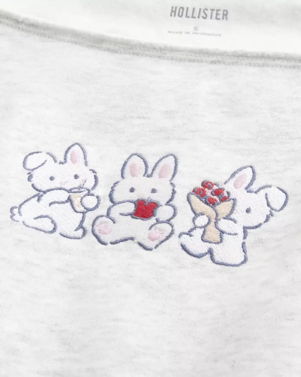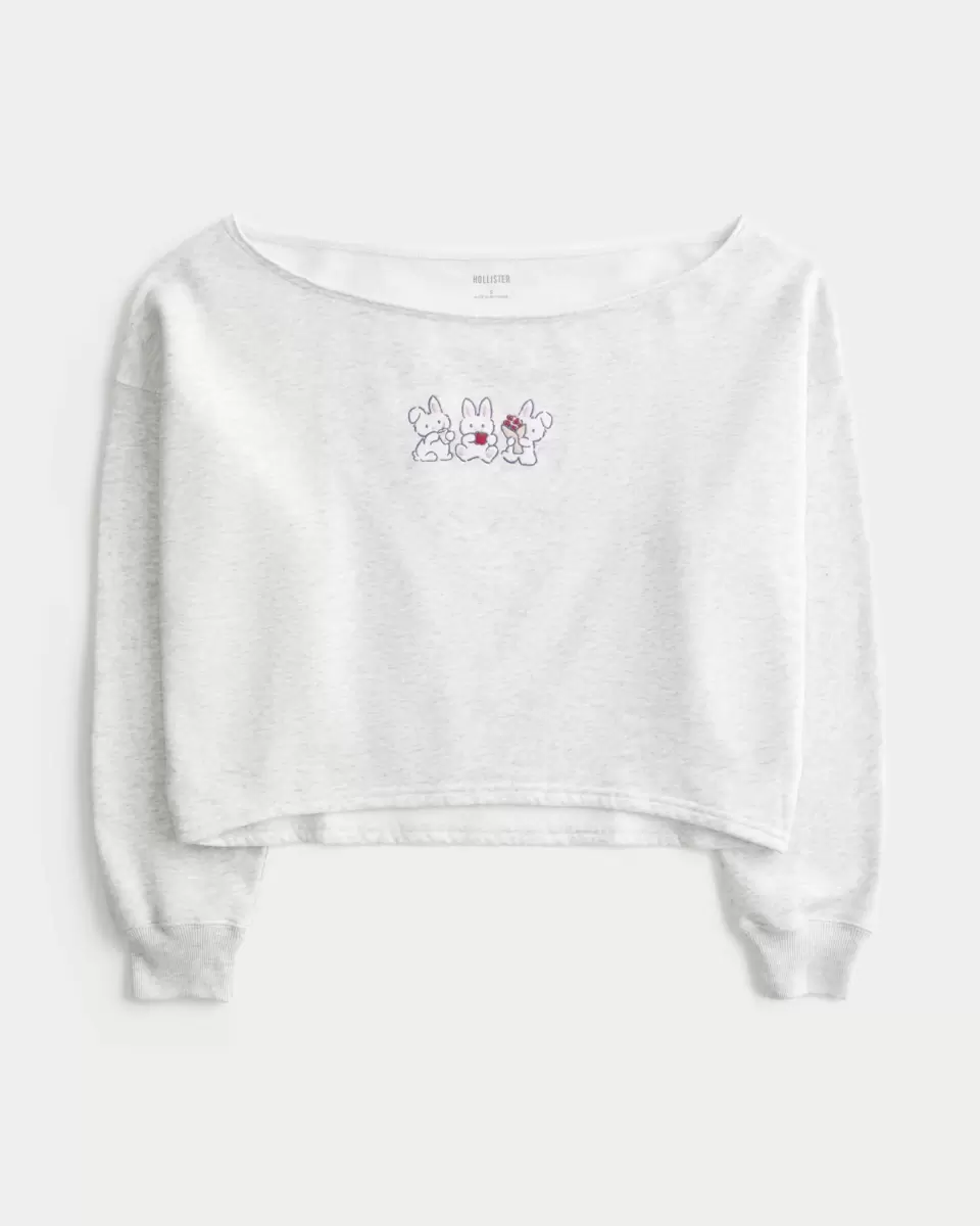 Ce sweat-shirt en polaire ultra doux présente une encolure décontractée qui peut être portée sur les deux épaules. Manches longues, adorable broderie lapin. Coupe facile. Importé.