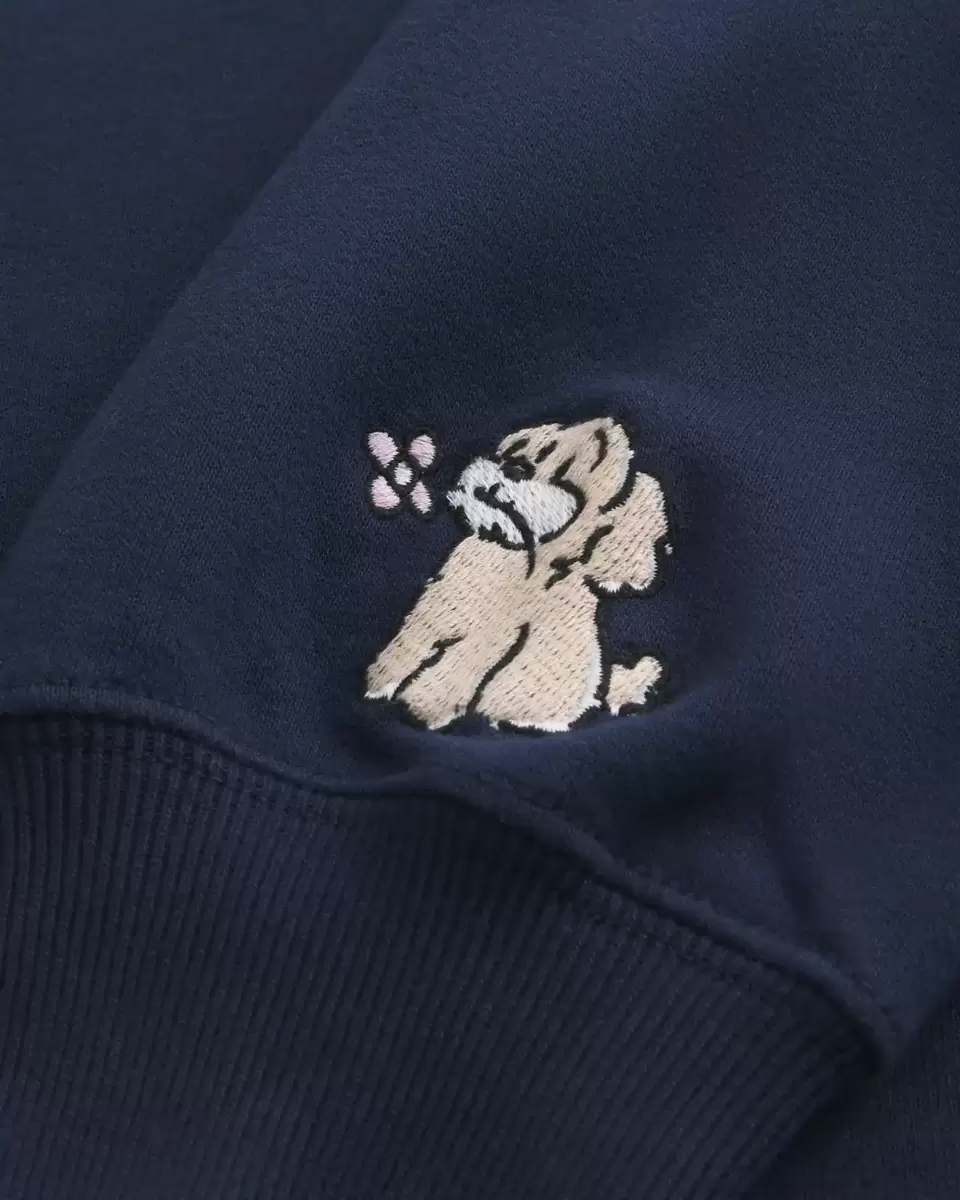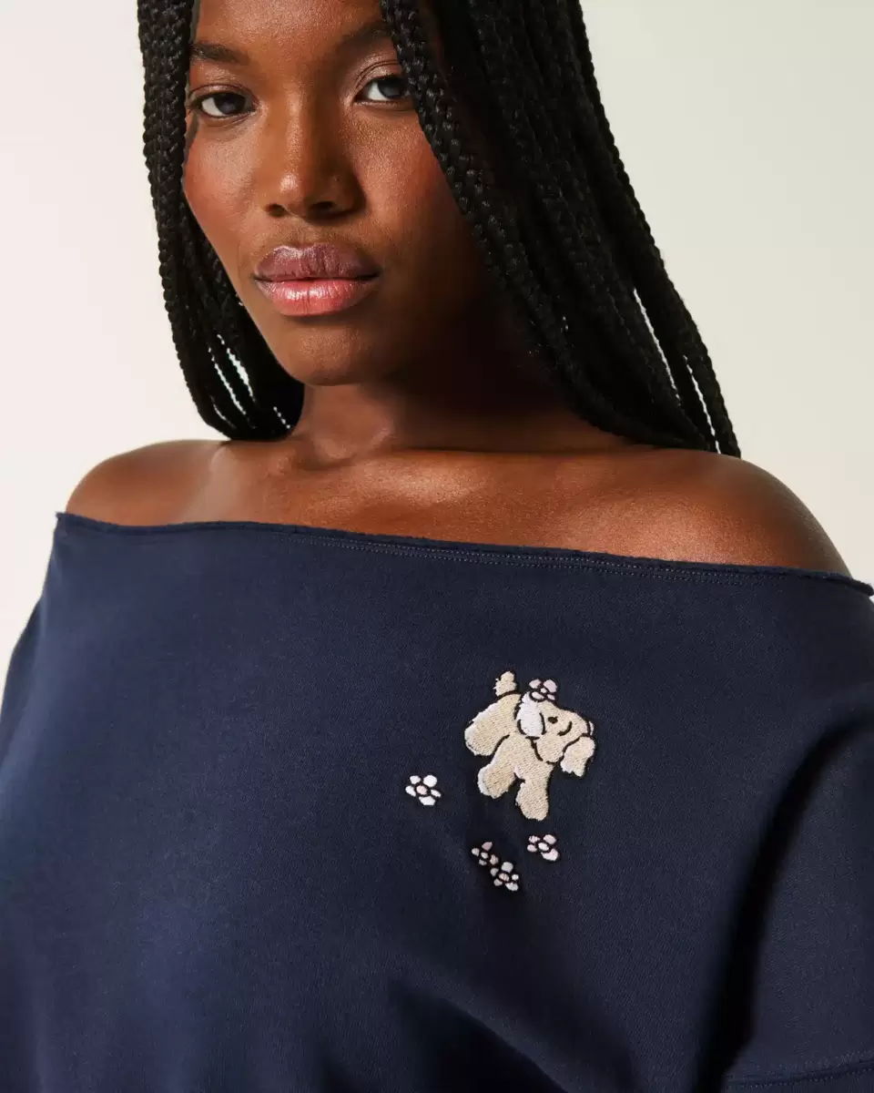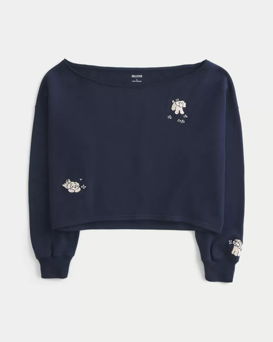 Ce sweat-shirt en polaire ultra doux présente une encolure décontractée qui peut être portée sur les deux épaules. Manches longues, adorable broderie chien. Coupe facile. Importé.