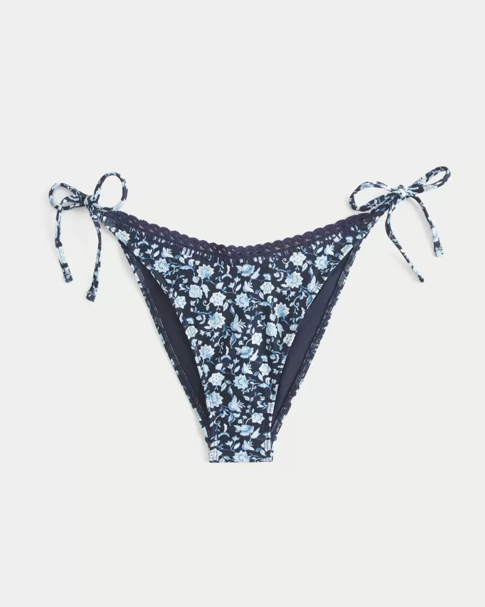 Ce joli bas de bikini est confectionné dans un tissu de bain doux et présente des finitions crochetées. Liens latéraux, couverture coquine. Importé.